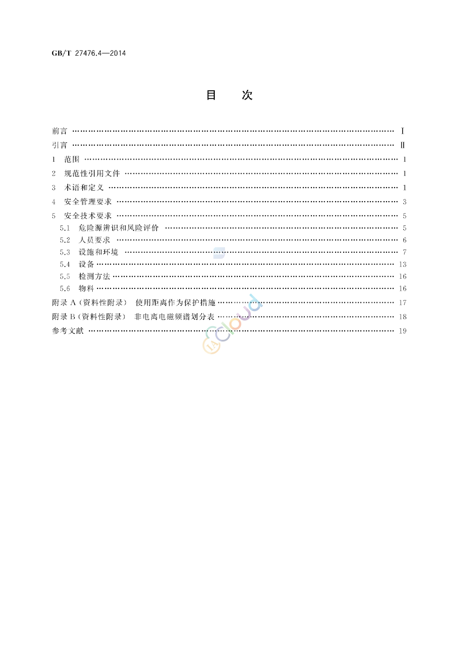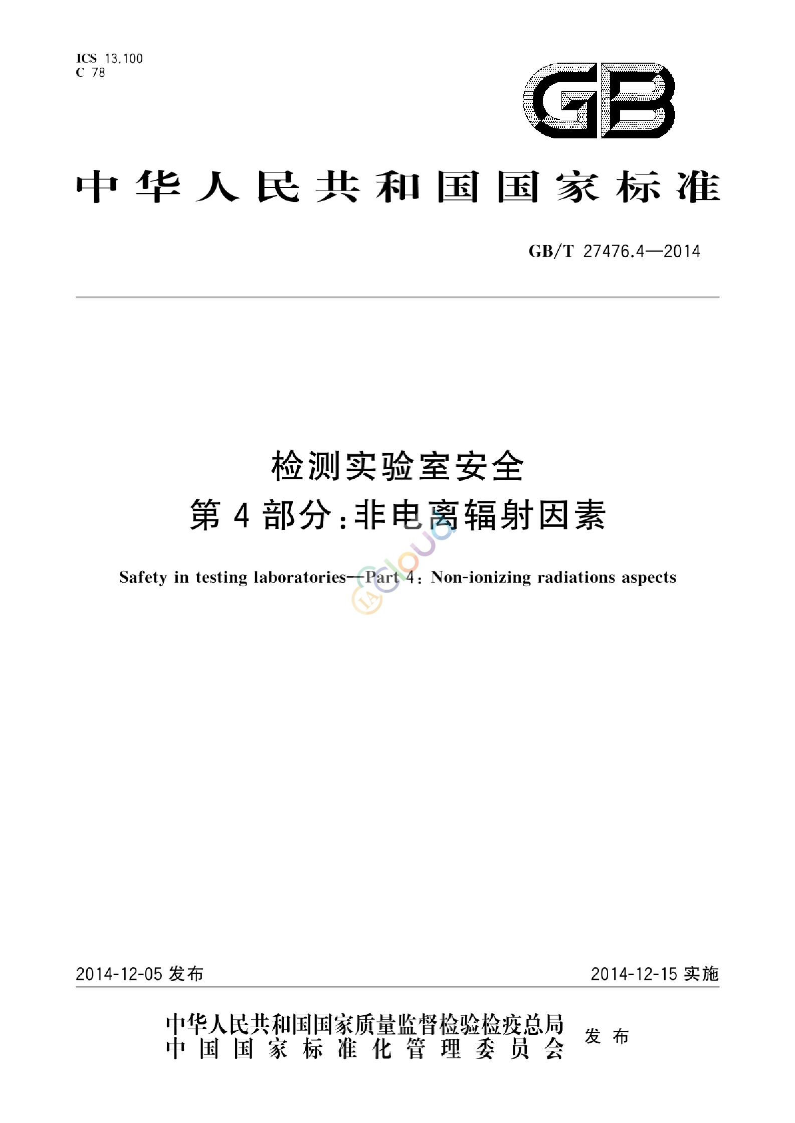 GB/T 27476的本部分规定了检测实验室(以下简称实验室)与非电离辐射因素相关的安全要求。 本部分给出了非电离辐射的限值要求,并提出了详细的建议,以防止这些辐射引起的伤害或者由于使用这些辐射引起的其他伤害。 本部分不包括非电离辐射全面的使用处理和安全要求。 本部分不包括在实验室以外的工作场所以及为了医学目的而进行的非电离辐射曝露。 本部分不包括对实验室人员进行医疗检查时可能曝露的非电离辐射的要求。