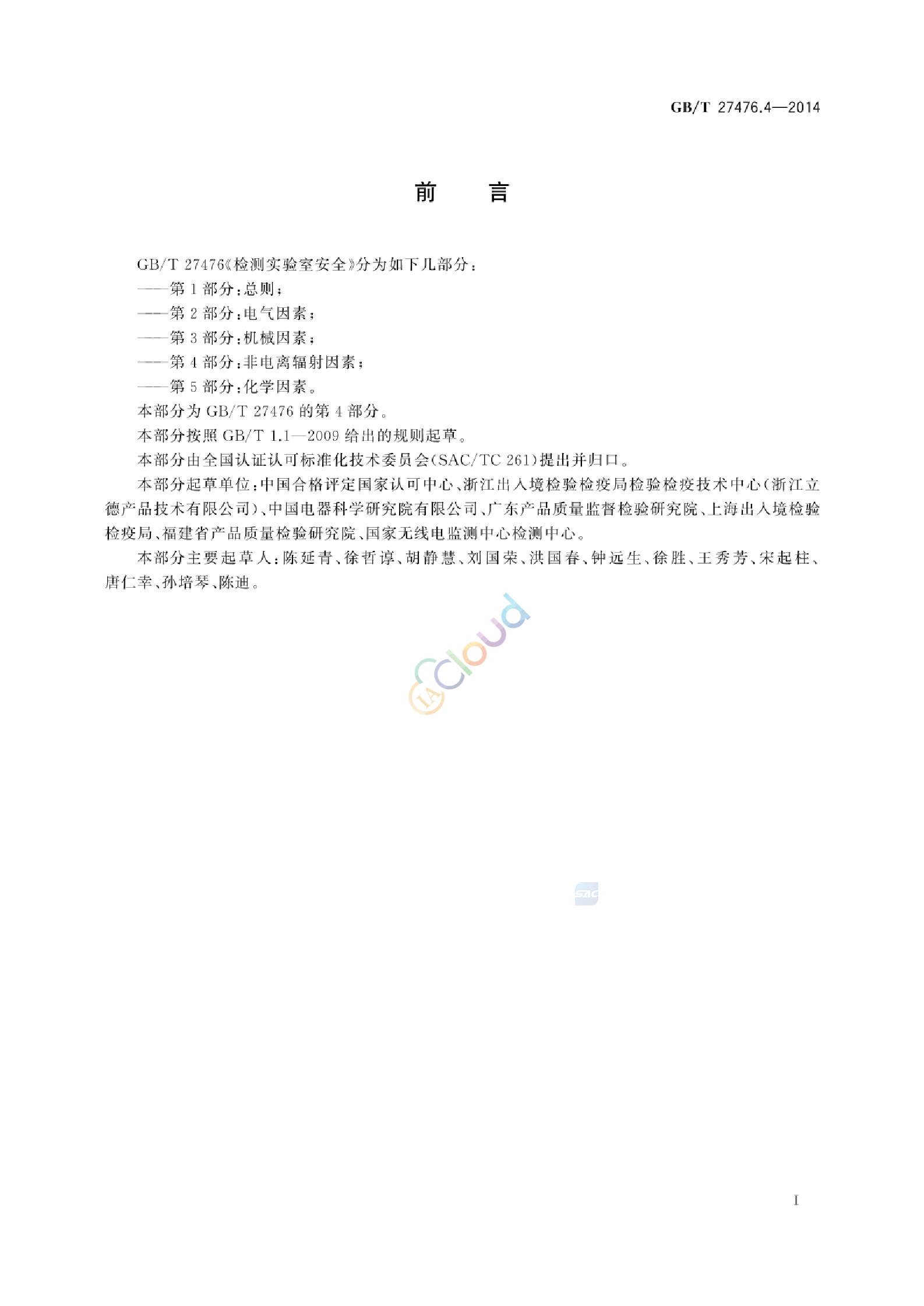 本部分为GB/T 27476 的第4部分。 本部分按照GB/T1.1—2009给出的规则起草。 本部分由全国认证认可标准化技术委员会(SAC/TC 261)提出并归口。 主要起草单位:中国合格评定国家认可中心 、浙江出入境检验检疫局检验检疫技术中心(浙江立德产品技术有限公司) 、中国电器科学研究院有限公司 、广东产品质量监督检验研究院 、上海出入境检验检疫局 、福建省产品质量检验研究院 、国家无线电监测中心监测中心 。 主要起草人:陈延青 、徐哲谆 、胡静慧 、刘国荣 、洪国春 、钟远生 。