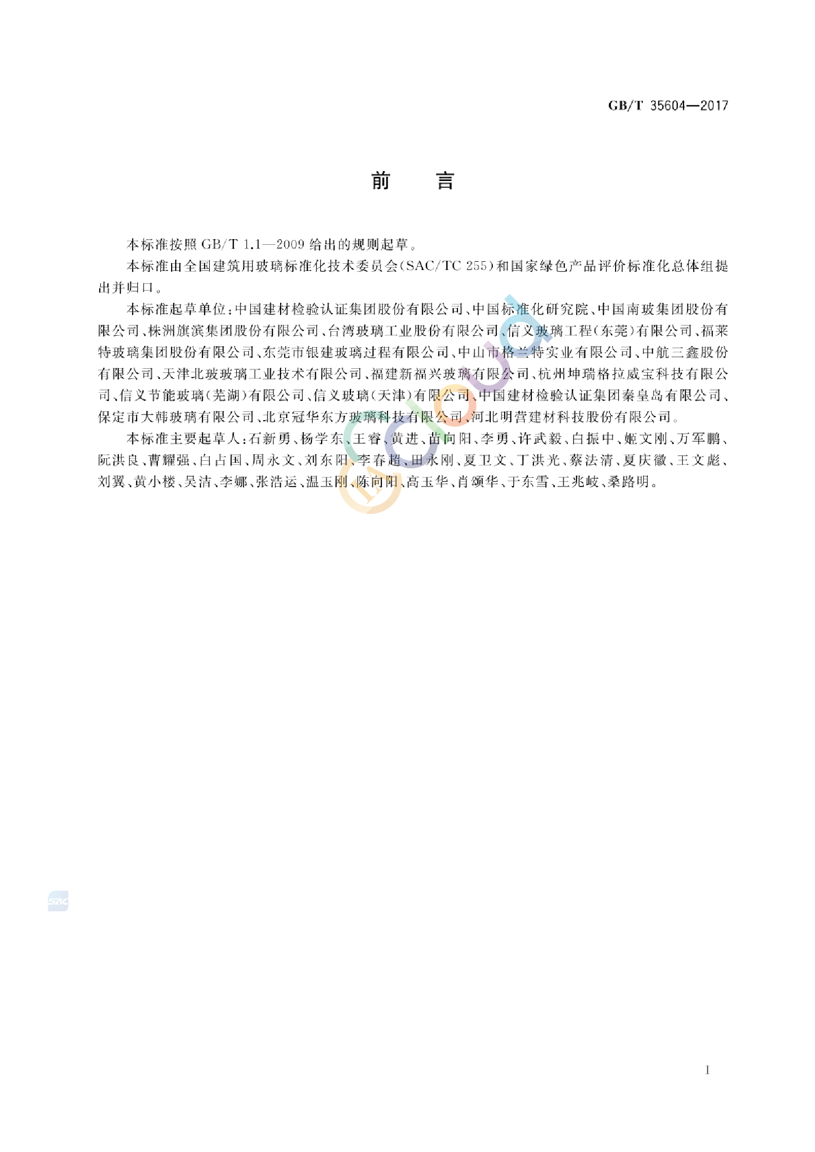 本标准按照GB/T 1.1——2009给出的规则起草。 本标准由全国建筑用玻璃标准化技术委员会(SAC/TC 255)和国家绿色产品评价标准化总体组提出并归口。 主要起草单位 中国建材检验认证集团股份有限公司 、中国标准化研究院 、中国南玻集团股份有限公司 、株洲旗滨集团股份有限公司 、台湾玻璃工业股份有限公司 、信义玻璃工程(东莞)有限公司 、福莱特玻璃集团股份有限公司 、东莞市银建玻璃过程有限公司 、中山市格兰特实业有限公司 、中航三鑫股份有限公司 、天津北玻玻璃工业技术有限公司 、福建新福兴玻璃有限公司 、杭州坤瑞格拉威宝科技有限公司 、信义节能玻璃(芜湖)有限公司 、信义玻璃(天津)有限公司 、中国建材检验认证集团秦皇岛有限公司 、保定市大韩玻璃有限公司 、北京冠华东方玻璃科技有限公司 、河北明营建材科技股份有限公司 。 主要起草人 石新勇 、杨学东 、王睿 、黄进 、苗向阳 、李勇 、许武毅 、白振中 、姬文刚 、万军鹏 、阮洪良 、曹耀强 、白占国 、周永文 、刘东阳 、李春超 、田永刚 、夏卫文 、丁洪光 、蔡法清 、夏庆徽 、王文彪 、刘翼 、黄小楼 、吴洁 、李娜 、张浩运 、温玉刚 、陈向阳 、高玉华 、肖颂华 、于东雪 、王兆岐 、桑路明 。