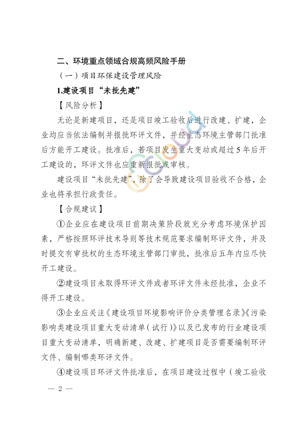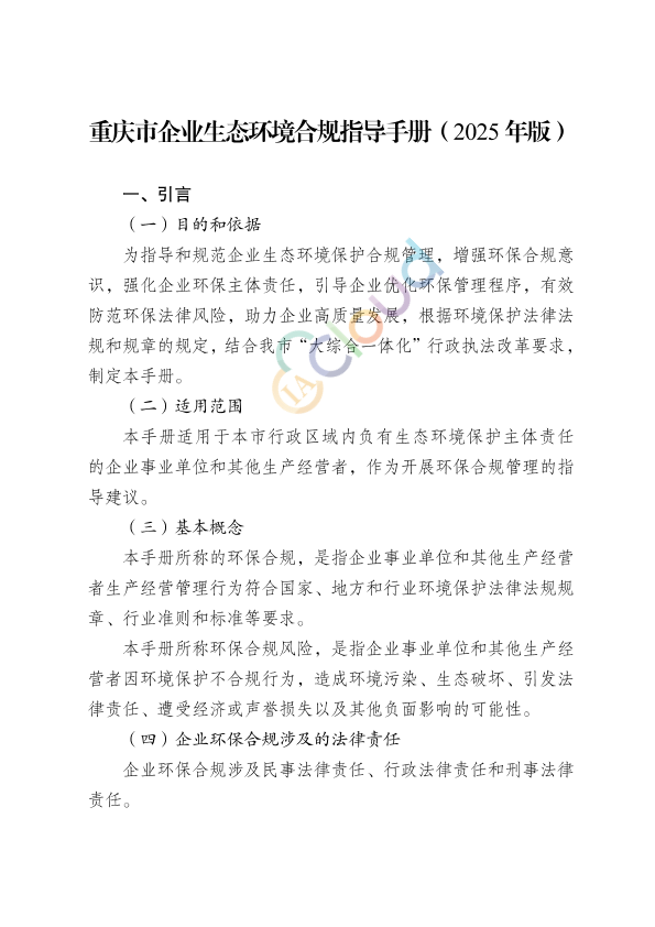 各有关单位: 为指导和规范企业生态环境保护合规管理,强化企业环境保护主体责任,引导企业优化环保管理程序,有效防范环保法律风险,助力企业高质量发展,根据我市“大综合一体化”行政执法改革要求,我局研究制定了《重庆市企业生态环境合规指导手册(2025年版)》,现予公布,供企业参考。本手册未涉及事项以及法律法规、规章等有规定的,从其规定。 重庆市生态环境局 2025年9月24日