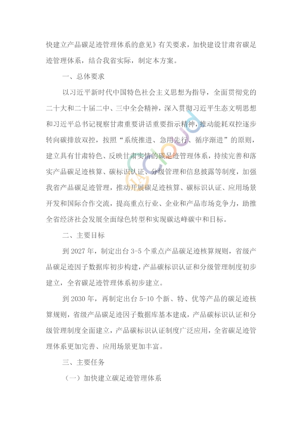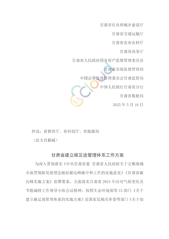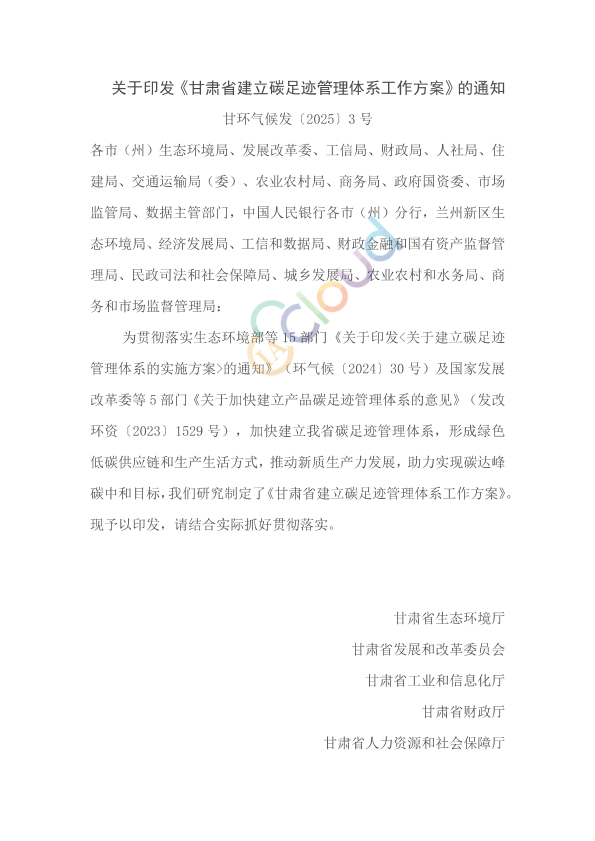 各市(州)生态环境局、发展改革委、工信局、财政局、人社局、住建局、交通运输局(委)、农业农村局、商务局、政府国资委、市场监管局、数据主管部门,中国人民银行各市(州)分行,兰州新区生态环境局、经济发展局、工信和数据局、财政金融和国有资产监督管理局、民政司法和社会保障局、城乡发展局、农业农村和水务局、商务和市场监督管理局: 为贯彻落实生态环境部等15部门《关于印发<关于建立碳足迹管理体系的实施方案>的通知》(环气候〔2024〕30号)及国家发展改革委等5部门《关于加快建立产品碳足迹管理体系的意见》(发改环资〔2023〕1529号),加快建立我省碳足迹管理体系,形成绿色低碳供应链和生产生活方式,推动新质生产力发展,助力实现碳达峰碳中和目标,我们研究制定了《甘肃省建立碳足迹管理体系工作方案》。现予以印发,请结合实际抓好贯彻落实。 甘肃省生态环境厅 甘肃省发展和改革委员会 甘肃省工业和信息化厅 甘肃省财政厅 甘肃省人力资源和社会保障厅 甘肃省住房和城乡建设厅 甘肃省交通运输厅 甘肃省农业农村厅 甘肃省商务厅 甘肃省人民政府国有资产监督管理委员会 甘肃省市场监督管理局 中国证券监督管理委员会甘肃监管局 中国人民银行甘肃省分行 甘肃省数据局 2025年5月16日