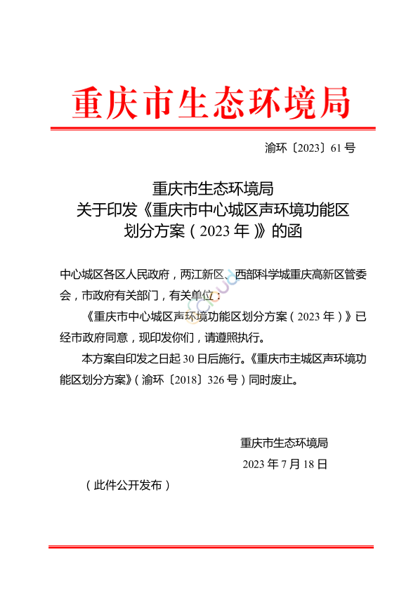 中心城区各区人民政府,两江新区、西部科学城重庆高新区管委会,市政府有关部门,有关单位: 《重庆市中心城区声环境功能区划分方案(2023年)》已经市政府同意,现印发你们,请遵照执行。 本方案自印发之日起30日后施行。《重庆市主城区声环境功能区划分方案》(渝环〔2018〕326号)同时废止。 重庆市生态环境局 2023年7月18日