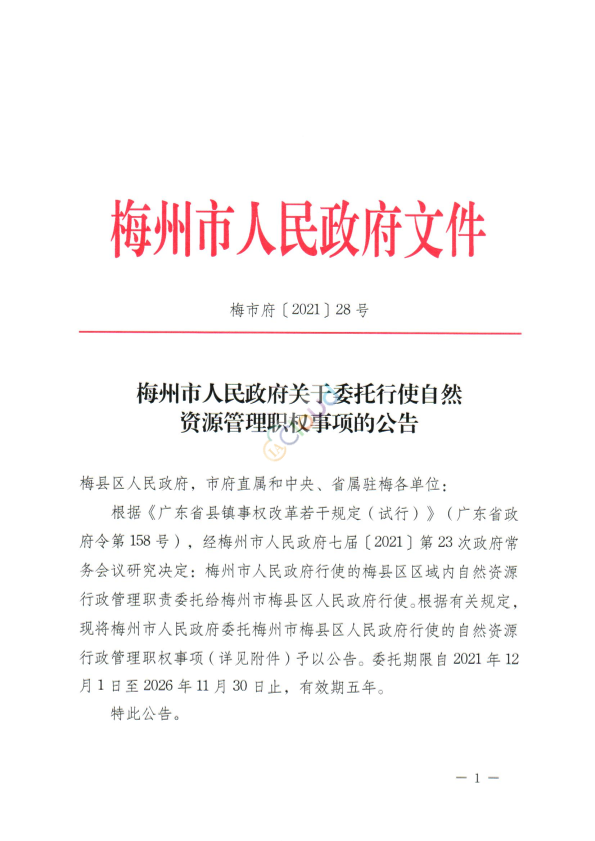 梅县区人民政府,市府直属和中央、省属驻梅各单位: 根据《广东省县镇事权改革若干规定(试行)》(广东省政府令第158号),经梅州市人民政府七届〔2021〕第23次政府常务会议研究决定:梅州市人民政府行使的梅县区区域内自然资源行政管理职责委托给梅州市梅县区人民政府行使。根据有关规定,现将梅州市人民政府委托梅州市梅县区人民政府行使的自然资源行政管理职权事项(详见附件)予以公告。委托期限自2021年12月1日至2026年11月30日止,有效期五年。 特此公告。 附件:梅州市人民政府委托梅州市梅县区人民政府行使梅县区区域内的自然资源行政管理职权事项目录表 梅州市人民政府 2021年12月7日