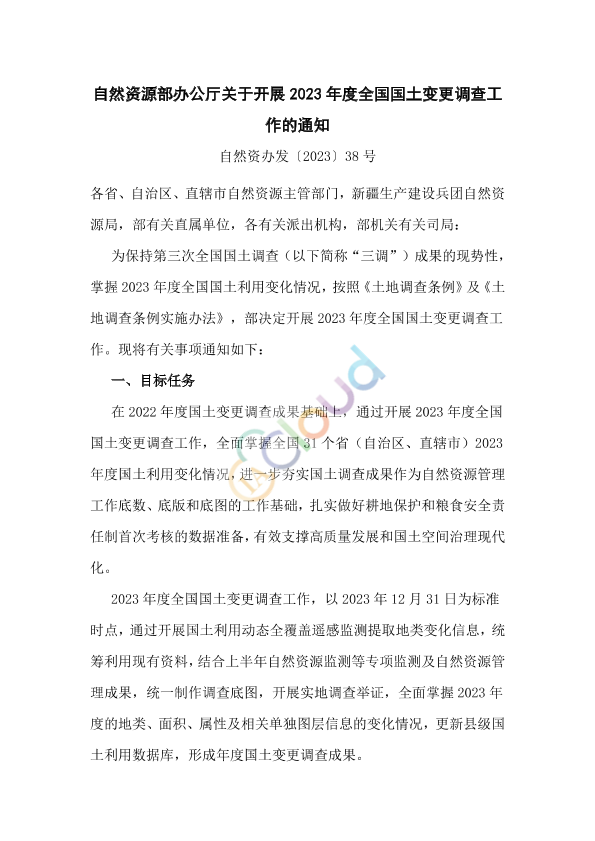 各省、自治区、直辖市自然资源主管部门,新疆生产建设兵团自然资源局,部有关直属单位,各有关派出机构,部机关有关司局: 为保持第三次全国国土调查(以下简称“三调”)成果的现势性,掌握2023年度全国国土利用变化情况,按照《土地调查条例》及《土地调查条例实施办法》,部决定开展2023年度全国国土变更调查工作。现将有关事项通知如下: