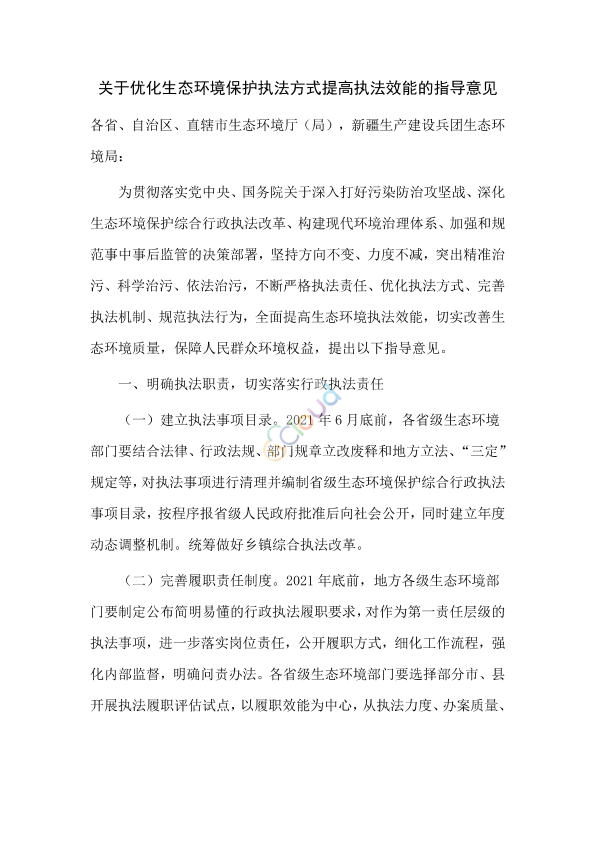 各省、自治区、直辖市生态环境厅(局),新疆生产建设兵团生态环境局: 为贯彻落实党中央、国务院关于深入打好污染防治攻坚战、深化生态环境保护综合行政执法改革、构建现代环境治理体系、加强和规范事中事后监管的决策部署,坚持方向不变、力度不减,突出精准治污、科学治污、依法治污,不断严格执法责任、优化执法方式、完善执法机制、规范执法行为,全面提高生态环境执法效能,切实改善生态环境质量,保障人民群众环境权益,提出以下指导意见。