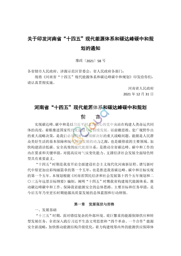 各省辖市人民政府、济源示范区管委会,省人民政府各部门: 现将《河南省“十四五”现代能源体系和碳达峰碳中和规划》印发给你们,请认真贯彻实施。 河南省人民政府 2021年12月31日