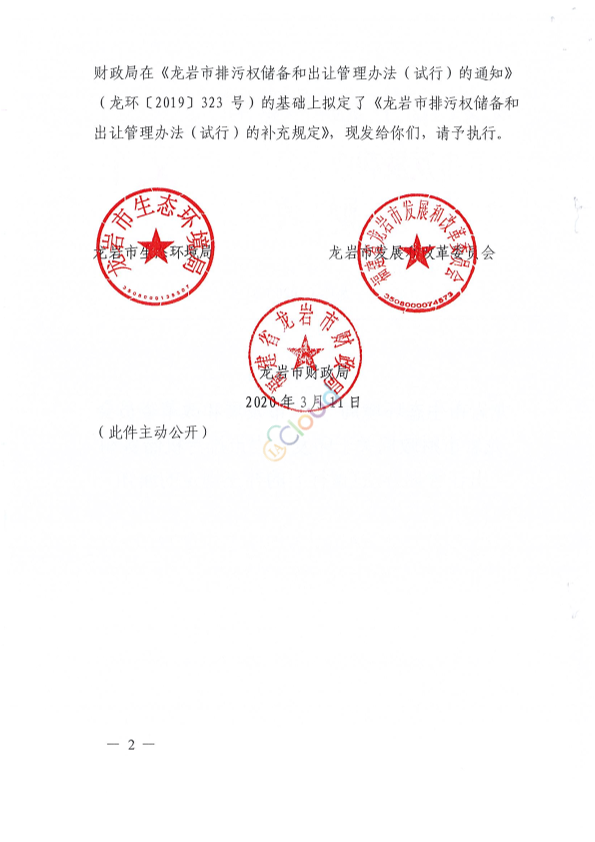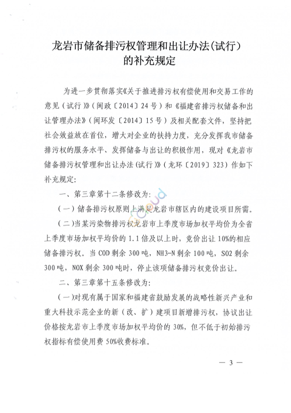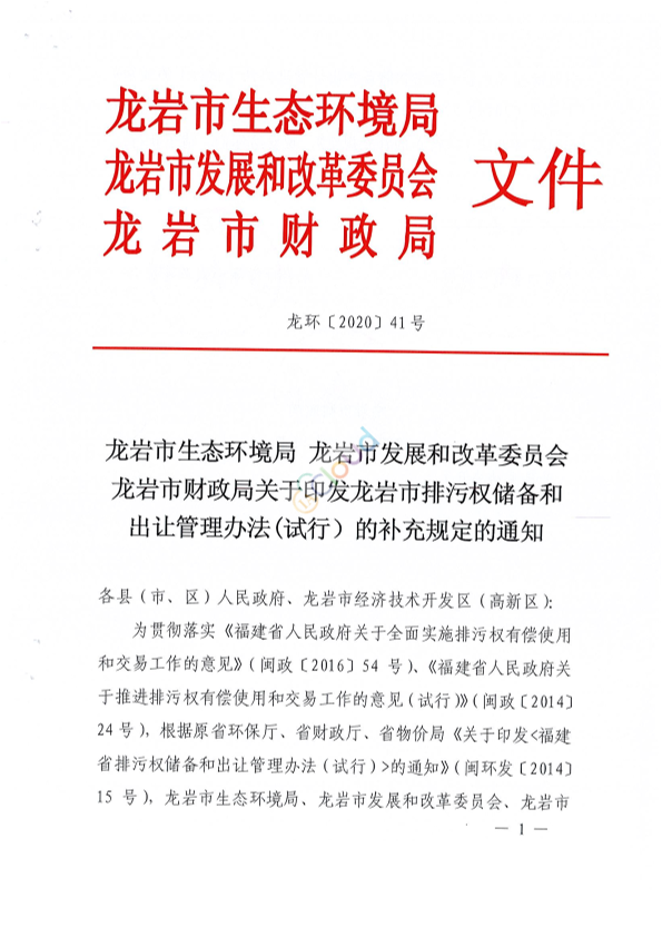 各县(市、区)人民政府、龙岩市经济技术开发区(高新区): 为贯彻落实《福建省人民政府关于全面实施排污权有偿使用和交易工作的意见》(闽政[2016] 54号)、《福建省人民政府关于推进排污权有偿使用和交易工作的意见(试行)》(闽政[2014]24号),根据原省环保厅、省财政厅、省物价局《关于印发<福建省排污权储备和出让管理办法(试行)>的通知》(闽环发[2014]15号),龙岩市生态环境局、龙岩市发展和改革委员会、龙岩市财政局在《龙岩市排污权储备和出让管理办法(试行)的通知》(龙环[2019] 323号)的基础上拟定了《龙岩市排污权储备和出让管理办法(试行)的补充规定》,现发给你们,请予执行。