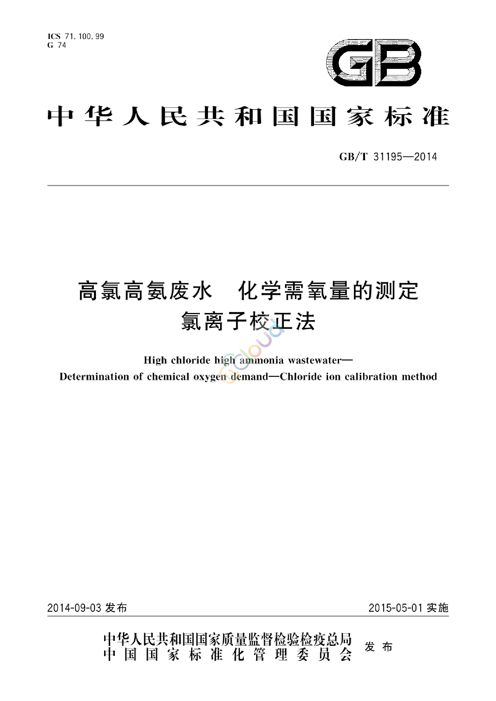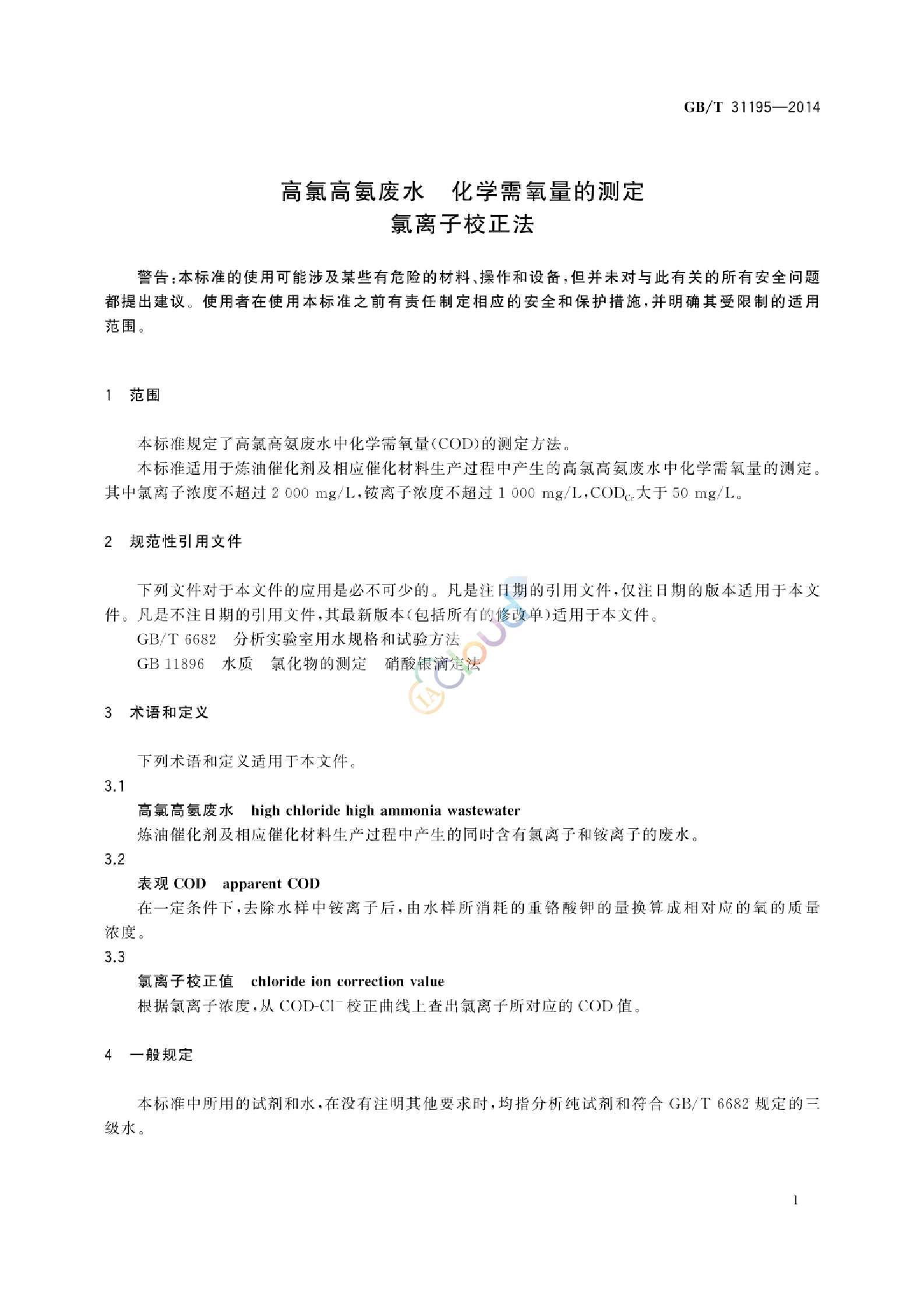 本标准规定了高氯高氨废水中化学需氧量(COD)的测定方法。 本标准适用于炼油催化剂及相应催化材料生产过程中产生的高氯高氨废水中化学需氧量的测定。其中氯离子浓度不超过2 000 mg/L,铵离子浓度不超过1 000 mg/L,COD,大于50 mg/L。