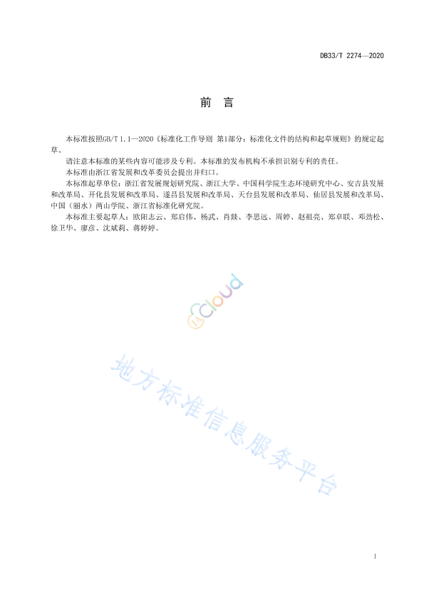 本标准按照GB/T 1.1—2020《标准化工作导则 第1部分:标准化文件的结构和起草规则》的规定起草。 请注意本标准的某些内容可能涉及专利。本标准的发布机构不承担识别专利的责任。 本标准由浙江省发展和改革委员会提出并归口。 本标准起草单位:浙江省发展规划研究院、浙江大学、中国科学院生态环境研究中心、安吉县发展和改革局、开化县发展和改革局、遂昌县发展和改革局、天台县发展和改革局、仙居县发展和改革局、中国(丽水)两山学院、浙江省标准化研究院。 本标准主要起草人:欧阳志云、郑启伟、杨武、肖燚、李思远、周婷、赵祖亮、郑卓联、邓劲松、徐卫华、廖彦、沈斌莉、蒋婷婷。