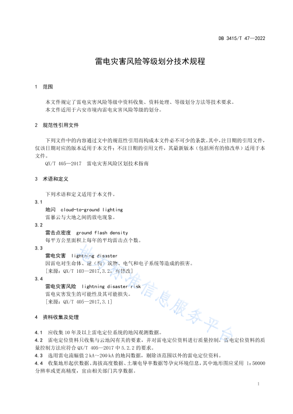 本文件规定了雷电灾害风险等级中资料收集、资料处理、等级划分方法等技术要求。 本文件适用于六安市境内雷电灾害风险等级的划分。