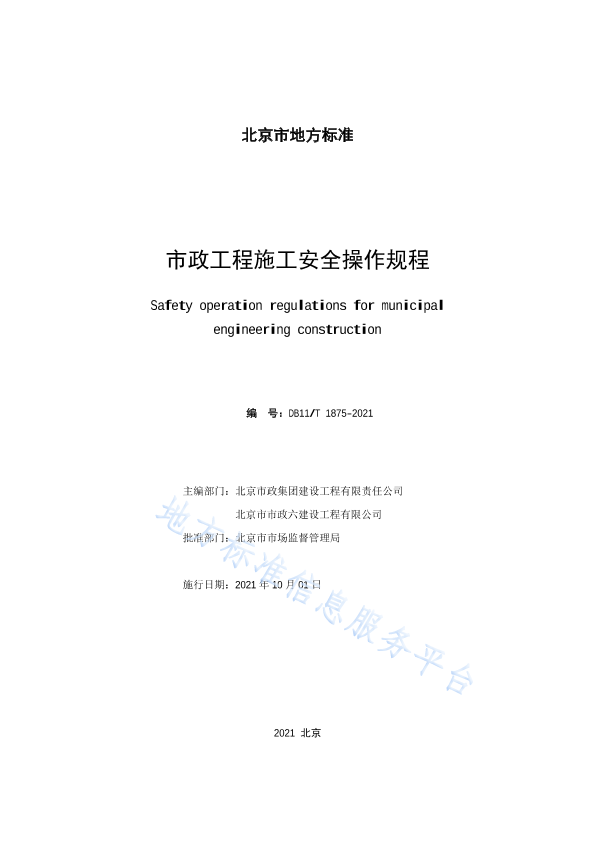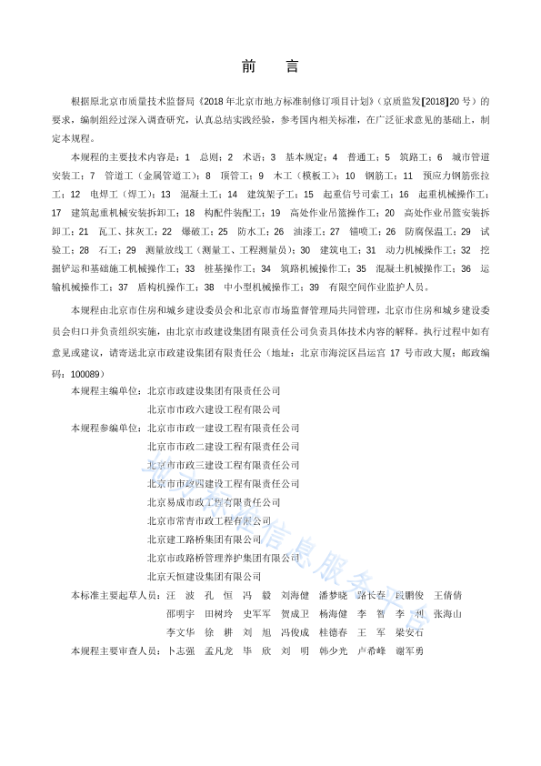 根据原北京市质量技术监督局《2018 年北京市地方标准制修订项目计划》(京质监发[2018]20 号)的要求,编制组经过深入调查研究,认真总结实践经验,参考国内相关标准,在广泛征求意见的基础上,制定本规程。 本规程的主要技术内容是:1 总则;2 术语;3 基本规定;4 普通工;5 筑路工;6 城市管道安装工;7 管道工(金属管道工);8 顶管工;9 木工(模板工);10 钢筋工;11 预应力钢筋张拉工;12 电焊工(焊工);13 混凝土工;14 建筑架子工;15 起重信号司索工;16 起重机械操作工;17 建筑起重机械安装拆卸工;18 构配件装配工;19 高处作业吊篮操作工;20 高处作业吊篮安装拆卸工;21 瓦工、抹灰工;22 爆破工;25 防水工;26 油漆工;27 锚喷工;26 防腐保温工;29 试验工;28 石工;29 测量放线工(测量工、工程测量员);30 建筑电工;31 动力机械操作工;32 挖掘铲运和基础施工机械操作工;33 桩基操作工;34 筑路机械操作工;35 混凝土机械操作工;36 运输机械操作工;37 盾构机操作工;38 中小型机械操作工;39 有限空间作业监护人员。 本规程由北京市住房和城乡建设委员会和北京市市场监督管理局共同管理,北京市住房和城乡建设委员会归口并负责组织实施,由北京市政建设集团有限责任公司负责具体技术内容的解释。执行过程中如有意见或建议,请寄送北京市政建设集团有限责任公(地址:北京市海淀区昌运宫17 号市政大厦;邮政编码:100089) 本规程主编单位:北京市政建设集团有限责任公司 北京市市政六建设工程有限公司 本规程参编单位:北京市市政一建设工程有限责任公司 北京市市政二建设工程有限责任公司 北京市市政三建设工程有限责任公司 北京市市政四建设工程有限责任公司 北京易成市政工程有限责任公司 北京市常青市政工程有限公司 北京建工路桥集团有限公司 北京市政路桥管理养护集团有限公司 北京天恒建设集团有限公司