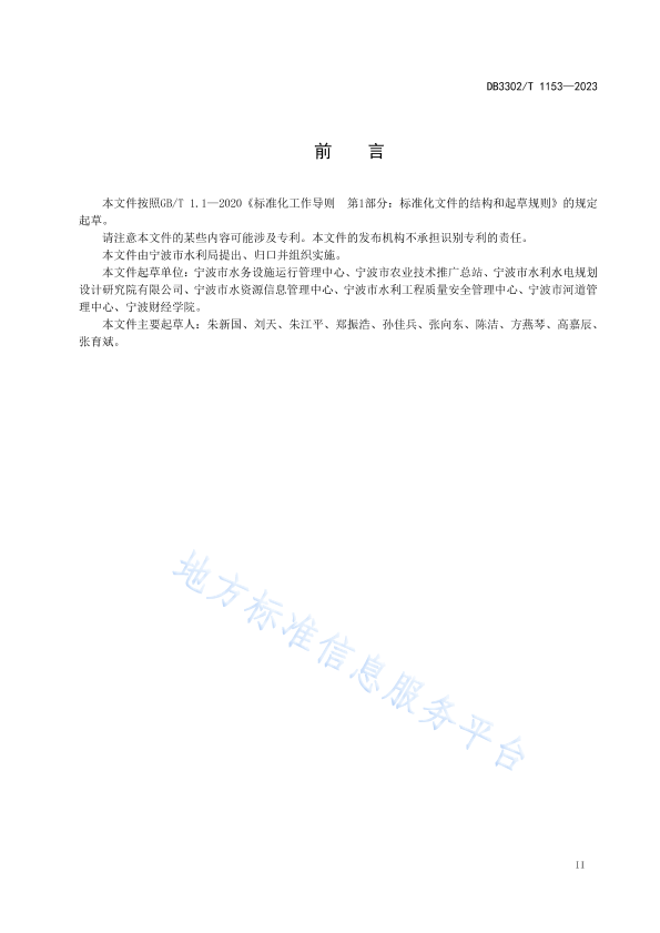 本文件按照GB/T 1.1—2020《标准化工作导则 第1部分:标准化文件的结构和起草规则》的规定起草。 请注意本文件的某些内容可能涉及专利。本文件的发布机构不承担识别专利的责任。 本文件由宁波市水利局提出、归口并组织实施。 本文件起草单位:宁波市水务设施运行管理中心、宁波市农业技术推广总站、宁波市水利水电规划设计研究院有限公司、宁波市水资源信息管理中心、宁波市水利工程质量安全管理中心、宁波市河道管理中心、宁波财经学院。