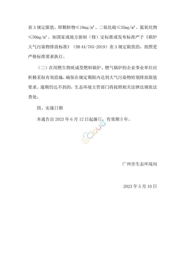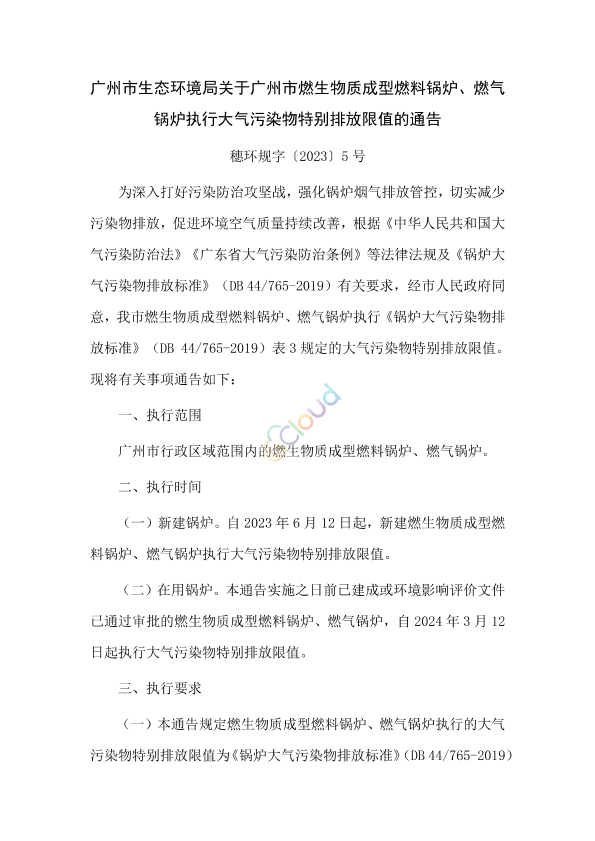 为深入打好污染防治攻坚战,强化锅炉烟气排放管控,切实减少污染物排放,促进环境空气质量持续改善,根据《中华人民共和国大气污染防治法》《广东省大气污染防治条例》等法律法规及《锅炉大气污染物排放标准》(DB 44/765-2019)有关要求,经市人民政府同意,我市燃生物质成型燃料锅炉、燃气锅炉执行《锅炉大气污染物排放标准》(DB 44/765-2019)表3规定的大气污染物特别排放限值。现将有关事项通告如下: