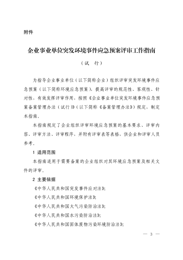 各省、自治区、直辖市环境保护厅(局),新疆生产建设兵团环境保护局: 为指导企业事业单位做好突发环境事件应急预案评审工作,我部组织编制了《企业事业单位突发环境事件应急预案评审工作指南(试行)》(以下简称《评审工作指南》),现印发给你们。 《评审工作指南》规定了企业组织评审突发环境事件应急预案的基本要求、评审内容、评审方法、评审程序,供企业自行组织评审时参照使用。请各地结合实际,加强宣传、培训、指导,切实发挥评审作用,推动企业不断提升预案质量。 附件:企业事业单位突发环境事件应急预案评审工作指南(试行) 环境保护部办公厅 2018年1月30日 抄送:国务院办公厅应急办。 环境保护部办公厅2018年1月31日印发