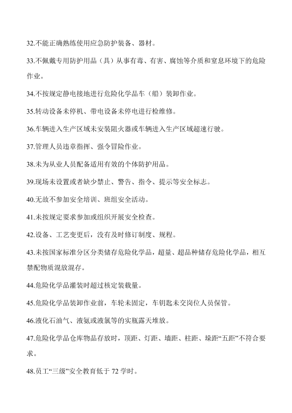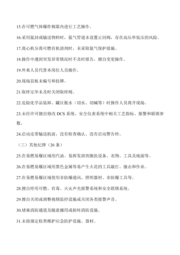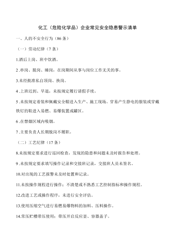 各设区市应急管理局: 为进一步指导化工(危险化学品)企业扎实开展隐患排查治理工作,增强企业隐患排查治理的可操作性,推动企业主动落实安全生产主体责任,有效防范和化解安全风险,省厅认真梳理近两年来深度检查指导发现的安全隐患,形成《化工(危险化学品)企业常见安全隐患警示清单》(以下简称《警示清单》)。《警示清单》共244条,其中人的不安全行为86条,物的不安全状态102条和管理缺陷56条,是化工(危险化学品)企业主要负责人、各层级管理人员和一线员工在日常工作中经常性、重复性发生的不符合安全生产要求的问题,是化工(危险化学品)企业在日常安全生产工作中必须禁止或避免发生的事项,是《江苏省危险化学品安全生产深度检查指导表》的补充。 各地要立即将《警示清单》传达至相关化工(危险化学品)企业,督促企业组织从业人员认真学习,结合企业安全管理实际,进一步补充完善《警示清单》,并逐项逐条开展自查自改,持续运用《警示清单》规范和加强安全生产管理,严防化工(危险化学品)企业生产安全事故发生。 附件:化工(危险化学品)企业常见安全隐患警示清单 江苏省应急管理厅办公室 2019年8月9日