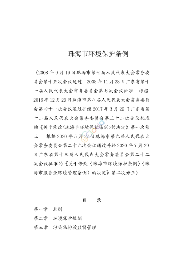2008 年 9 月 19 日珠海市第七届人民代表大会常务委员会第十五次会议通过 2008年11月28日广东省第十一届人民代表大会常务委员会第七次会议批准 根据2016年12月29日珠海市第八届人民代表大会常务委员会第四十一次会议通过并经 2017 年 3 月 29 日广东省第十二届人民代表大会常务委员会第三十二次会议批准的《关于修改的决定》第一次修正 根据 2020 年 5 月 27 日珠海市第九届人民代表大会常务委员会第二十九次会议通过并经 2020 年 7 月 29日广东省第十三届人民代表大会常务委员会第二十二次会议批准的《关于修改〈珠海市环境保护条例〉〈珠海市服务业环境管理条例〉的决定》第二次修正