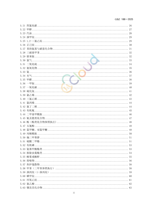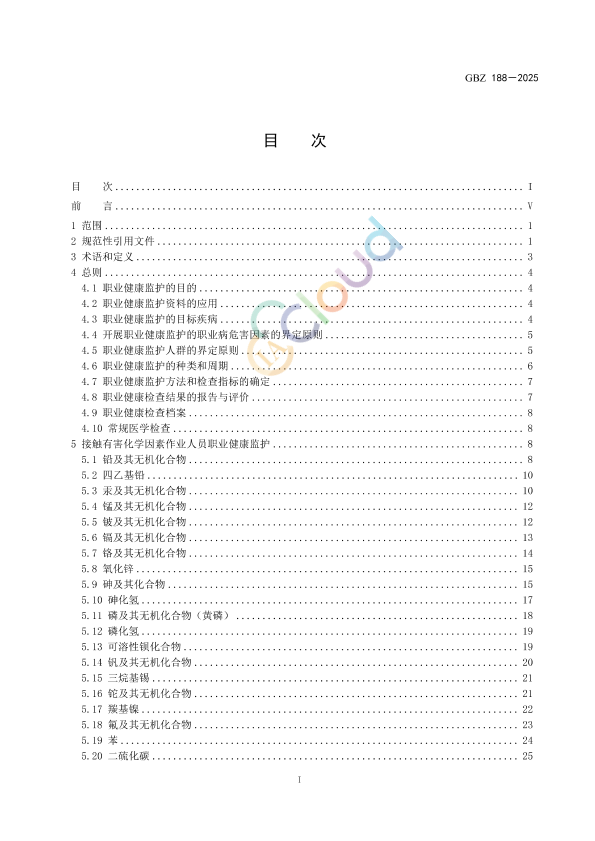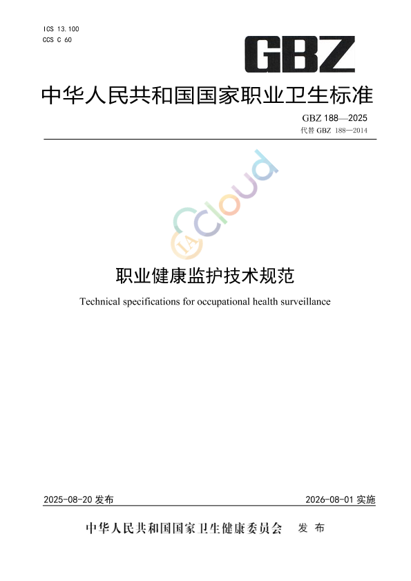 本标准为强制性标准。 本标准代替GBZ 188—2014《职业健康监护技术规范》,与GBZ 188—2014相比,除结构性调整和编辑性改动外,主要技术变化如下: ——删除了体检结论中的复查项(见2014年版的4.8.3); ——更改了职业健康检查档案内容(见4.9,2014年版的4.9); ——增加了接触甲苯、溴丙烷、碘甲烷、环氧乙烷、氯乙酸、铟及其化合物、煤焦油、煤焦油沥青、石油沥青、β-萘胺、金属及其化合物粉尘(锡、铁、锑、钡及其化合物等)、硬金属粉尘、毛沸石粉尘、低温、激光、蜱传脑炎病毒、布氏疏螺旋体、人免疫缺陷病毒作业人员及刮研作业、井下工人长期蹲跪姿、爬行、侧卧、肩扛作业、制造业工人长时间腕部重复作业或用力作业、参与突发事件处置的应急救援作业人员的健康监护(见5.58、5.59、5.60、5.61、5.62、5.63、5.64、5.65、6.7、6.8、6.9、7.7、7.8、8.3、8.4、8.5、9.8、9.9、9.10); ——增加了接触铅及其无机化合物、砷及其化合物、氟及其无机化合物、二硫化碳、丙烯酰胺作业人员的应急健康检查(见5.1.4、5.9.4、5.18.4、5.20.4、5.49.4); ——增加了接触苯的氨基与硝基化合物、光气、一甲胺、有机氟、硫酸二甲酯作业人员的离岗时职业健康检查(见5.27、5.34、5.36、5.43、5.51,2014年版的第5章); ——删除了甲苯二异氰酸酯(见2014年版的5.44); ——删除了结核病防治作业、肝炎病防治作业(见2014年版的9.4、9.5); ——删除了上岗前、在岗期间和离岗时职业健康检查中的选检项目,保留应急健康检查中的选检项目(见2014年版的第5章、第6章、第7章、第8章和第9章); ——增加了部分危害因素的补充检查项目(见第5章、第6章、第7章和第9章); ——增加了已颁布职业接触生物限值的生物标志物的检测(见第5章); ——更改了正确使用本标准的说明(见附录A,2014年版的附录A); ——更改了神经系统常规检查,并将常规检查内容放入附录B(见B.2.5,2014年版的4.10.2); ——删除了《粉尘作业人员胸部数字X射线摄影(DR摄片)技术要求》(见2014年版的附录C); ——增加了《职业病危害因素作业人员推荐性检查》(见附录C); ——增加了《职业健康检查总结报告编制指南》(见附录E): ——增加了《疑似职业病告知书》(见附录G)。 本标准由国家卫生健康标准委员会职业健康标准专业委员会负责技术审查和技术咨询,由中国疾病预防控制中心负责协调性和格式审查,由国家卫生健康委职业健康司负责业务管理、法规司负责统筹管理。 本标准起草单位:中国疾病预防控制中心职业卫生与中毒控制所、上海市化工职业病防治院、同济大学附属上海市肺科医院(上海市职业病防治院)、国家电网公司职业病防治院、浙江省疾病预防控制中心、北京市化工职业病防治院、山东省第二人民医院、首都医科大学附属北京朝阳医院、辽宁省疾病预防控制中心。 本标准主要起草人:余晨、李德鸿、孙道远、侯强、张巡淼、闫永建、袁伟明、宣逸群、乔昕、夏玉静、朱秋鸿、蒋轶文、齐放、吕向裴、王焕强。 本标准及其所代替标准的历次版本发布情况为: ——2007年首次发布为GBZ 188—2007,2014年第一次修订; ——本次为第二次修订。