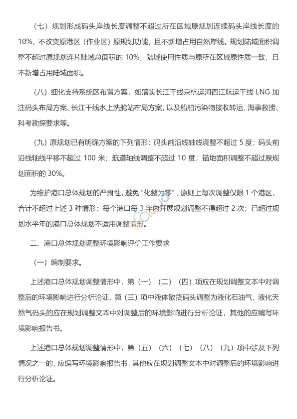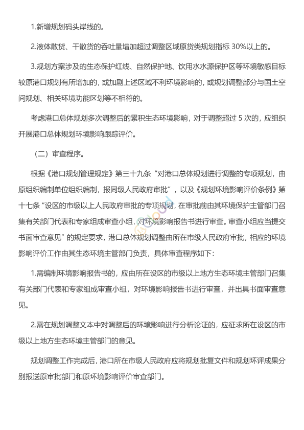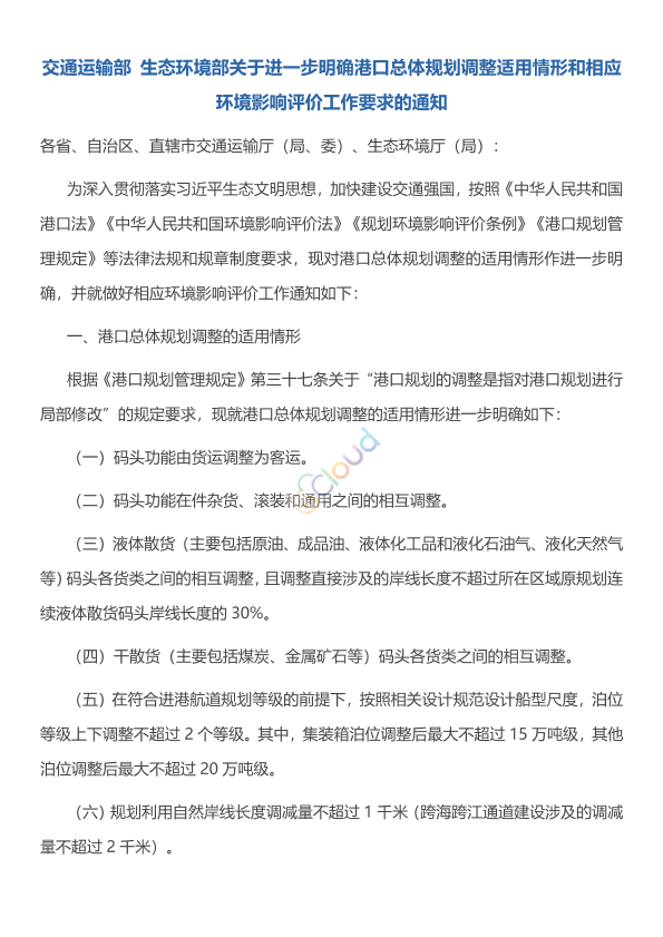 各省、自治区、直辖市交通运输厅(局、委)、生态环境厅(局): 为深入贯彻落实习近平生态文明思想,加快建设交通强国,按照《中华人民共和国港口法》《中华人民共和国环境影响评价法》《规划环境影响评价条例》《港口规划管理规定》等法律法规和规章制度要求,现对港口总体规划调整的适用情形作进一步明确,并就做好相应环境影响评价工作通知如下: