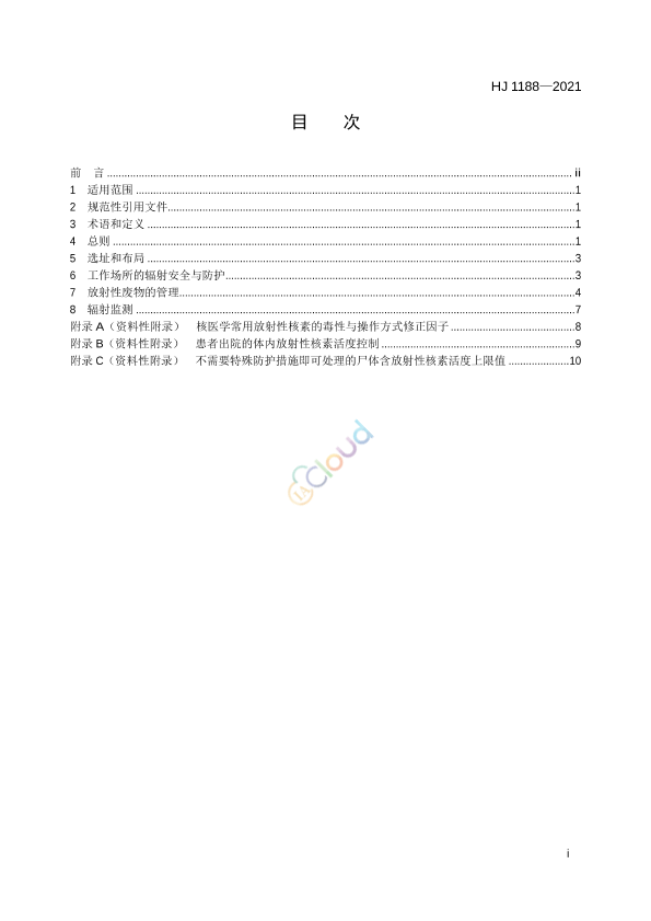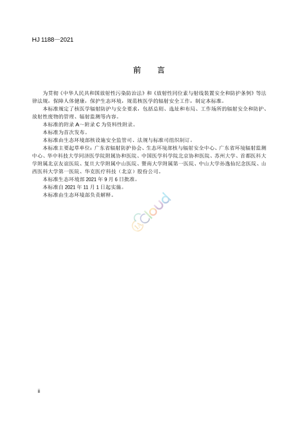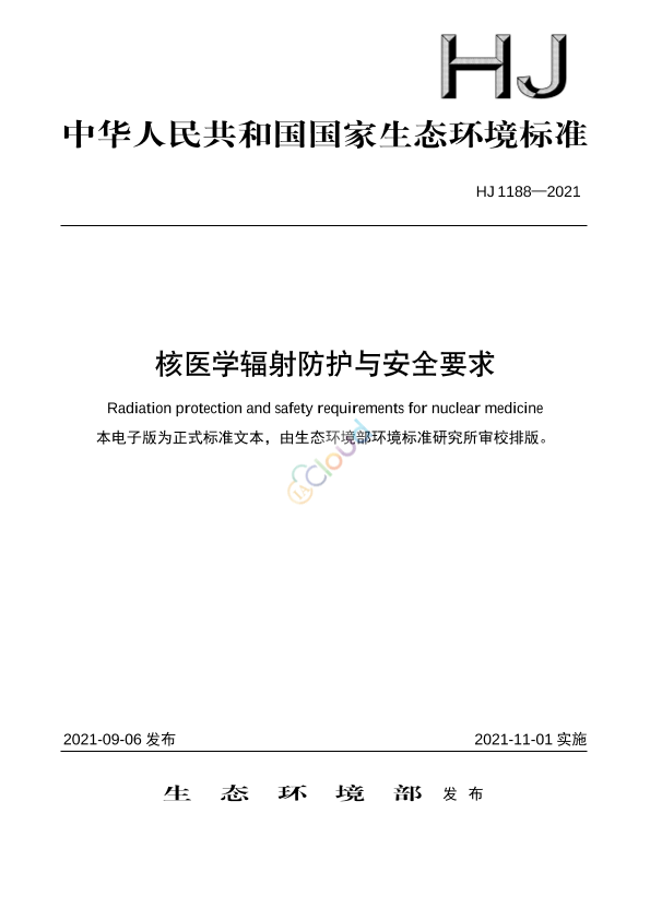 为贯彻《中华人民共和国放射性污染防治法》和《放射性同位素与射线装置安全和防护条例》等法律法规,保障人体健康,保护生态环境,规范核医学的辐射安全工作,制定本标准。 本标准规定了核医学辐射防护与安全要求,包括总则、选址和布局、工作场所的辐射安全和防护、放射性废物的管理、辐射监测等内容。 本标准的附录A~附录C为资料性附录。 本标准为首次发布。 本标准由生态环境部核设施安全监管司、法规与标准司组织制订。 本标准主要起草单位:广东省辐射防护协会、生态环境部核与辐射安全中心、广东省环境辐射监测中心、华中科技大学同济医学院附属协和医院、中国医学科学院北京协和医院、苏州大学、首都医科大学附属北京友谊医院、复旦大学附属中山医院、暨南大学附属第一医院、中山大学孙逸仙纪念医院、山西医科大学第一医院、华克医疗科技(北京)股份公司。 本标准生态环境部2021年9月6日批准。 本标准自2021年11月1日起实施。 本标准由生态环境部负责解释。