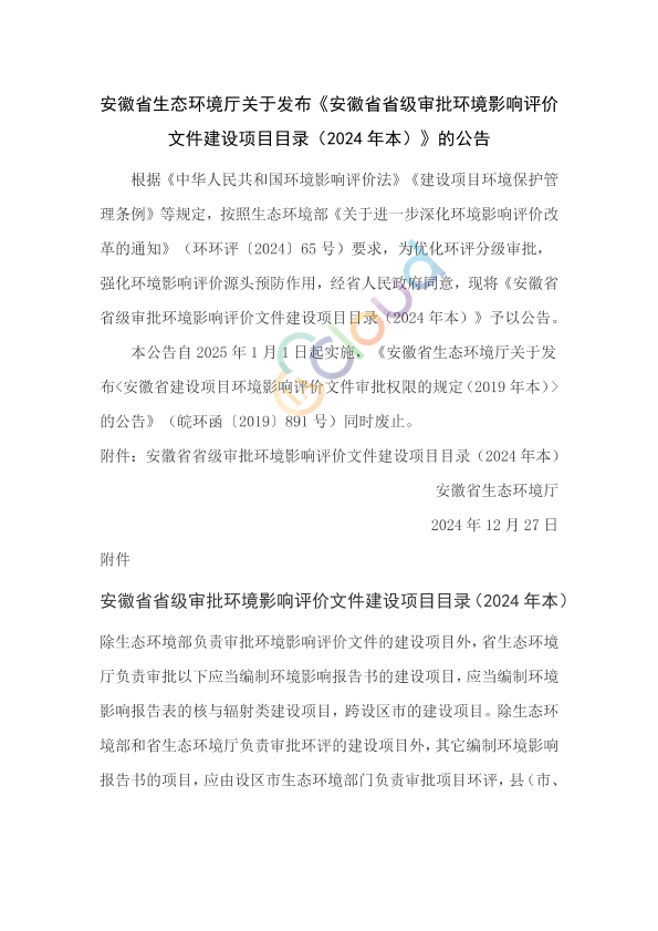 根据《中华人民共和国环境影响评价法》《建设项目环境保护管理条例》等规定,按照生态环境部《关于进一步深化环境影响评价改革的通知》(环环评〔2024〕65号)要求,为优化环评分级审批,强化环境影响评价源头预防作用,经省人民政府同意,现将《安徽省省级审批环境影响评价文件建设项目目录(2024年本)》予以公告。 本公告自2025年1月1日起实施,《安徽省生态环境厅关于发布<安徽省建设项目环境影响评价文件审批权限的规定(2019年本)>的公告》(皖环函〔2019〕891号)同时废止。 附件:安徽省省级审批环境影响评价文件建设项目目录(2024年本) 安徽省生态环境厅 2024年12月27日
