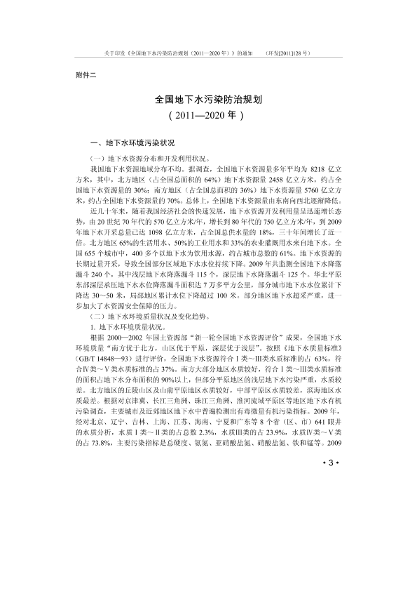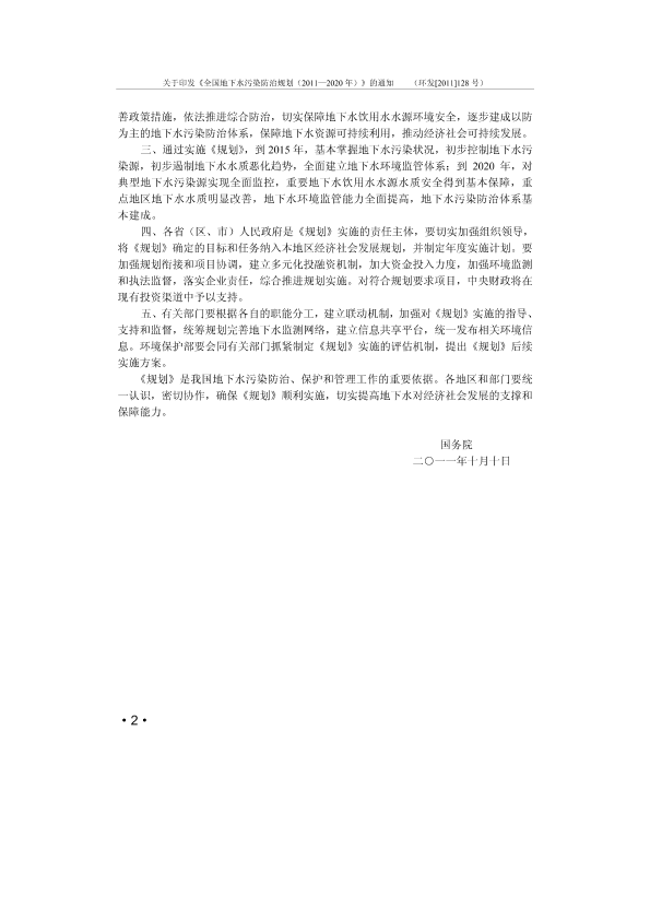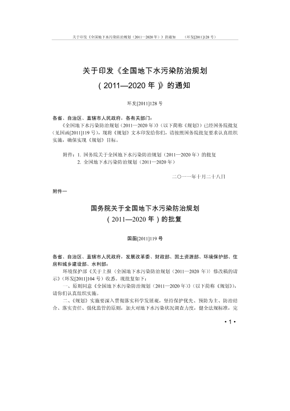 一、原则同意《全国地下水污染防治规划(2011—2020年)》(以下简称《规划》),请你们认真组织实施。