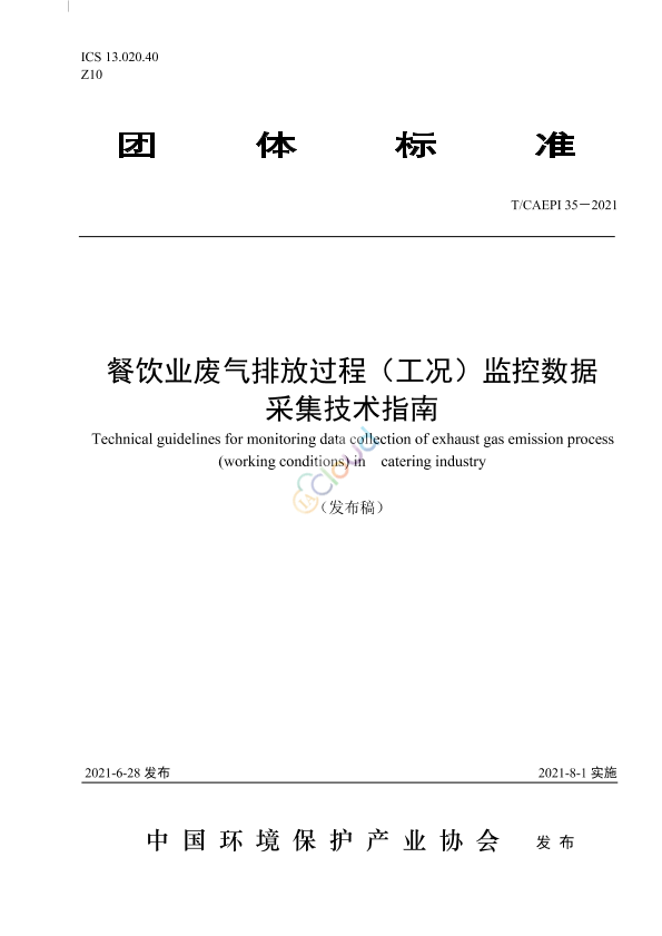为贯彻《中华人民共和国环境保护法》等法律法规,指导餐饮业废气排放过程(工况)监控系统的建设,规范餐饮废气治理设施运行状态监控的数据采集,保证排放过程(工况)数据采集、传输网络和监控中心的连通,制定本标准。 本标准基于《污染物在线监控(监测)系统数据传输标准》(HJ 212—2017)进行扩展。本标准仅显示新增或扩充的内容,HJ 212—2017 已规定的内容不再重复。本标准扩展的主要内容为: ——增加了餐饮业废气排放过程(工况)数据采集清单; ——扩充了废气排放过程(工况)监控治理工艺编码; ——扩充了废气监测因子编码; ——扩充了废气排放过程(工况)监控监测因子编码; ——扩充了现场端信息编码表; ——更新了餐饮业废气排放过程(工况)监控系统的通讯命令示例。 本标准为首次发布。 本标准由中国环境保护产业协会组织制订。 本标准起草单位:北京市环境保护科学研究院、北京万维盈创科技发展有限公司、西安交大长天软件股份有限公司、宁波方太厨具有限公司、江苏保丽洁环境科技股份有限公司、佛山市科蓝环保科技股份有限公司。 本标准主要起草人:石爱军、何万清、姬红波、钟海华、佟杰、王嘉华、何剑锋、何志涛、聂磊、骆子鑫、王天意、王志平。 本标准由中国环境保护产业协会2021 年6 月28 日批准。 本标准自2021 年8 月1 日起实施。 本标准由中国环境保护产业协会负责管理,由起草单位负责具体技术内容的解释。在应用过程中如有需要修改与补充的建议,请将相关资料寄送至中国环境保护产业协会标准管理部门(北京市西城区扣钟北里甲4 楼,邮编100037)。 请注意本标准的某些内容可能涉及专利。本标准的发布机构不承担识别这些专利的责任。
