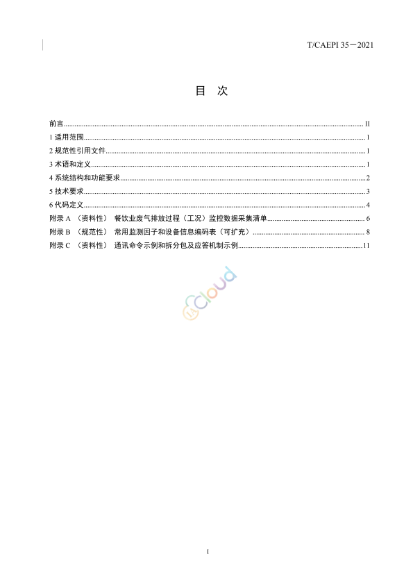 本标准规定了餐饮业废气排放过程(工况)监控系统的结构与功能要求、技术要求和代码定义。 本标准适用于餐饮业废气排放过程(工况)监控系统与监控中心之间的数据采集和传输。 本标准允许扩展,但扩展内容不得与本标准中所使用或保留的控制命令相冲突。