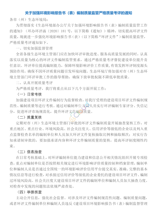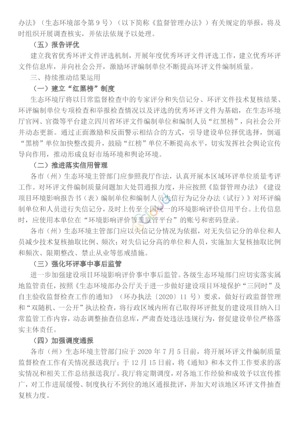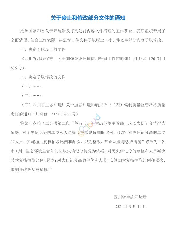 按照国家和省关于开展涉及行政处罚内容文件清理的工作要求,我厅组织开展了全面清理。结合工作实际,决定对1件文件予以废止,对3件文件部分内容予以修改。 一、决定予以废止的文件 《四川省环境保护厅关于加强企业环境信用管理工作的通知》(川环函〔2017〕1636号)。 二、决定予以修改的文件 (一)…… (二)…… (三)四川省生态环境厅关于加强环境影响报告书(表)编制质量监管严格质量考评的通知(川环函〔2020〕453号)