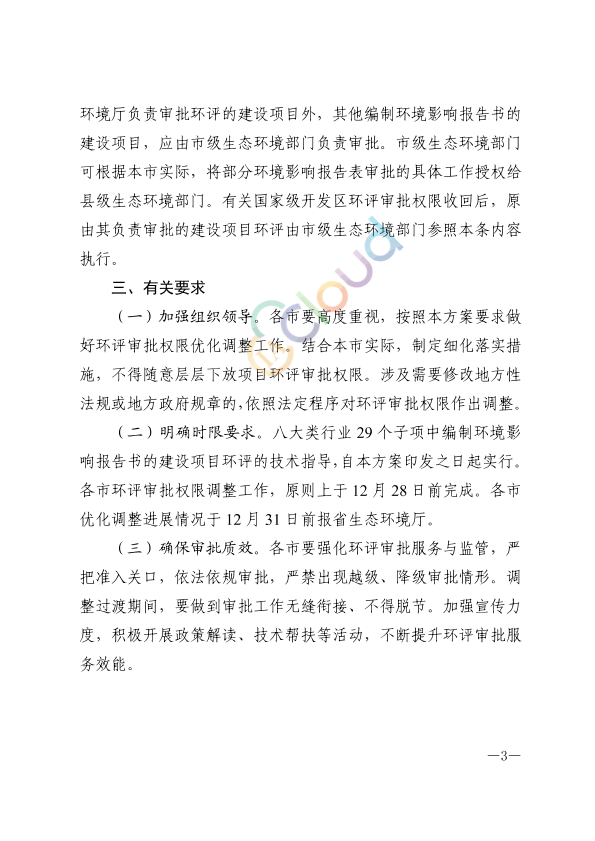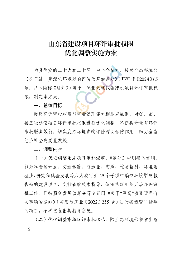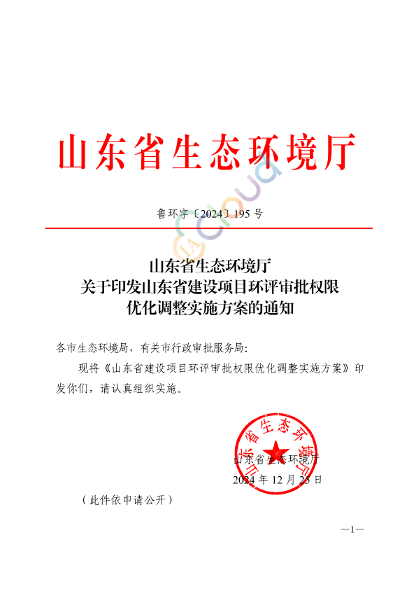 各市生态环境局,有关市行政审批服务局: 现将《山东省建设项目环评审批权限优化调整实施方案》印发你们,请认真组织实施。 山东省生态环境厅 2024年12月25日 (此件依申请公开)