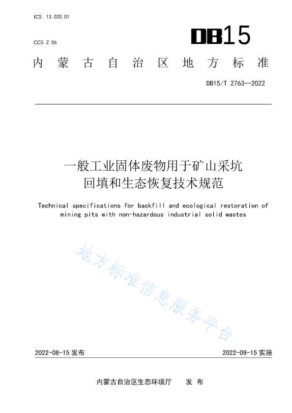 本文件规定了利用一般工业固体废物对矿山采坑进行回填和生态恢复的工作流程、基本要求、本底与固体废物调查、回填可行性分析、回填要求、生态恢复要求、污染控制要求、环境质量监测及相关管理要求。 本文件适用于内蒙古自治区利用一般工业固体废物对矿山采坑进行回填和生态恢复过程的环境本底调查、环境风险评估,以及回填和生态恢复的设计、运行和管理。