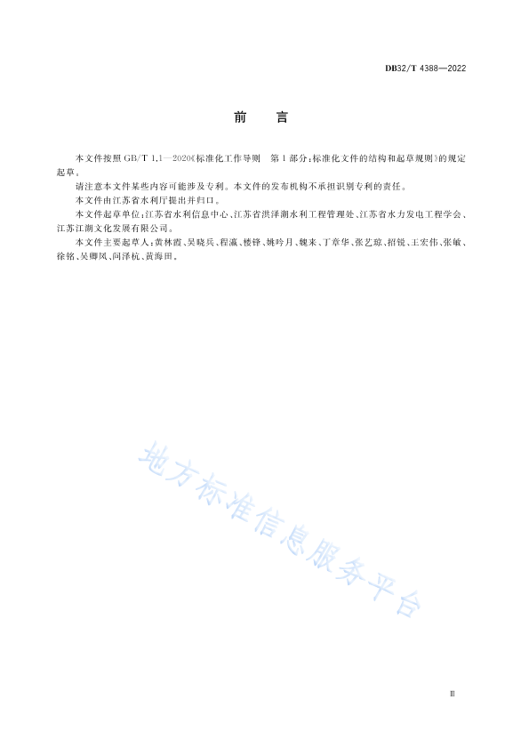 本文件按照GB/T 1.1-2020《标准化工作导则第 1部分:标准化文件的结构和起草规则》的规定起草。 请注意本文件某些内容可能涉及专利。本文件的发布机构不承担识别专利的责任。 本文件由江苏省水利厅提出并归口。 本文件起草单位:江苏省水利信息中心、江苏省洪泽湖水利工程管理处、江苏省水力发电工程学会、江苏江湖文化发展有限公司。 本文件主要起草人:黄林霞、吴晓兵、程瀛、楼锋、姚吟月,魏来、丁章华、张艺琼招锐、王宏伟、张敏、徐铭,吴卿凤、问泽杭、黄海田。