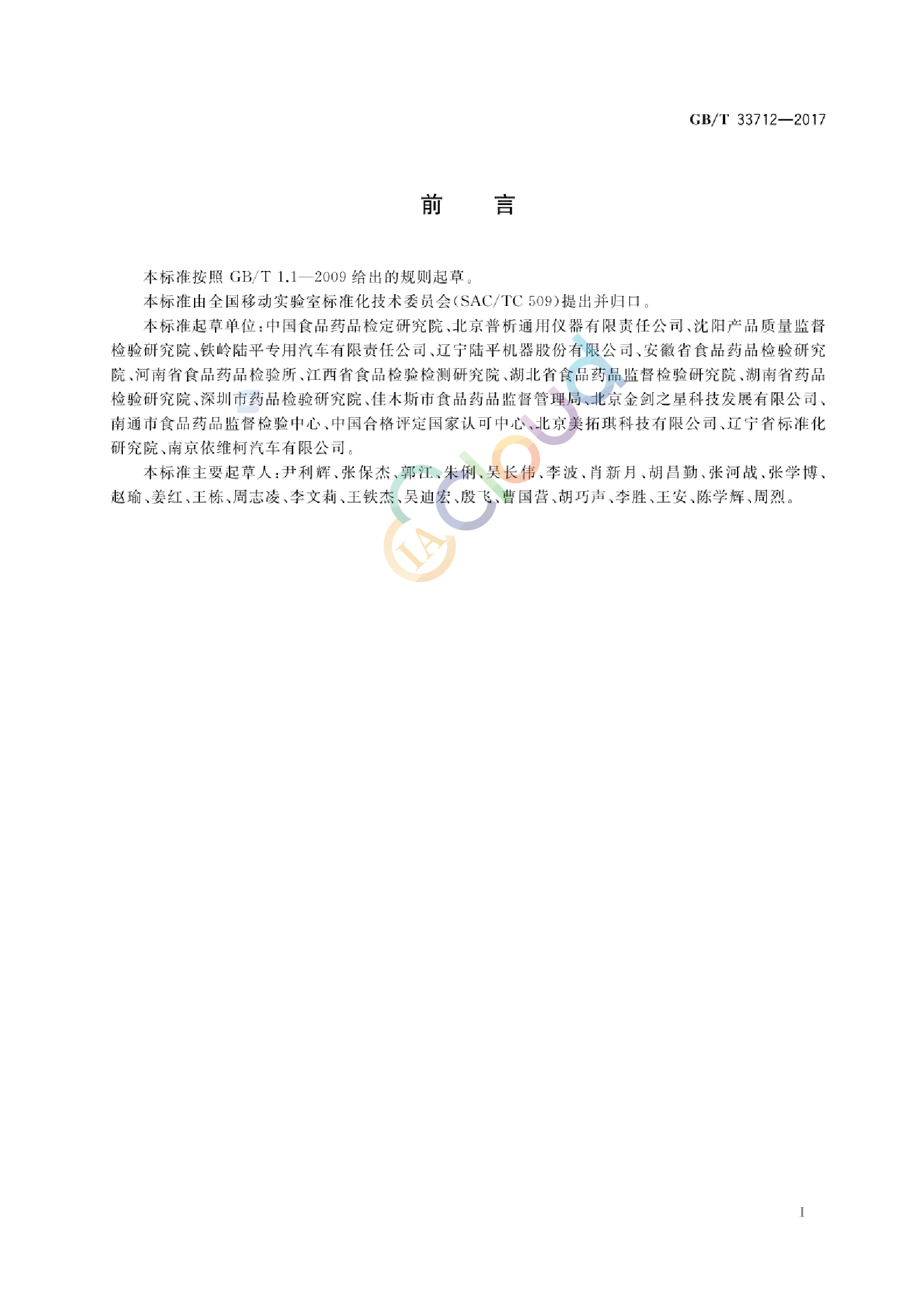 本标准按照GB/T1.1——2009给出的规则起草。 本标准由全国移动实验室标准化技术委员会(SAC/TC 509)提出并归口。 主要起草单位 中国食品药品检定研究院 、北京普析通用仪器有限责任公司 、沈阳产品质量监督检验研究院 、铁岭陆平专用汽车有限责任公司 、辽宁陆平机器股份有限公司 、安徽省食品药品检验研究院 、河南省食品药品检验所 、江西省食品检验检测研究院 、湖北省食品药品监督检验研究院 、湖南省药品检验研究院 、深圳市药品检验研究院 、佳木斯市食品药品监督管理局 、北京金剑之星科技发展有限公司 、南通市食品药品监督检验中心 、中国合格评定国家认可中心 、北京美拓琪科技有限公司 、辽宁省标准化研究院 、南京依维柯汽车有限公司 。 主要起草人 尹利辉 、张保杰 、郭江 、朱俐 、吴长伟 、李波 、肖新月 、胡昌勤 、张河战 、张学博 、赵瑜 、姜红 、王栋 、周志凌 、李文莉 、王铁杰 、吴迪宏 、殷飞 、曹国营 、胡巧声 、李胜 、王安 、陈学辉 、周烈 。