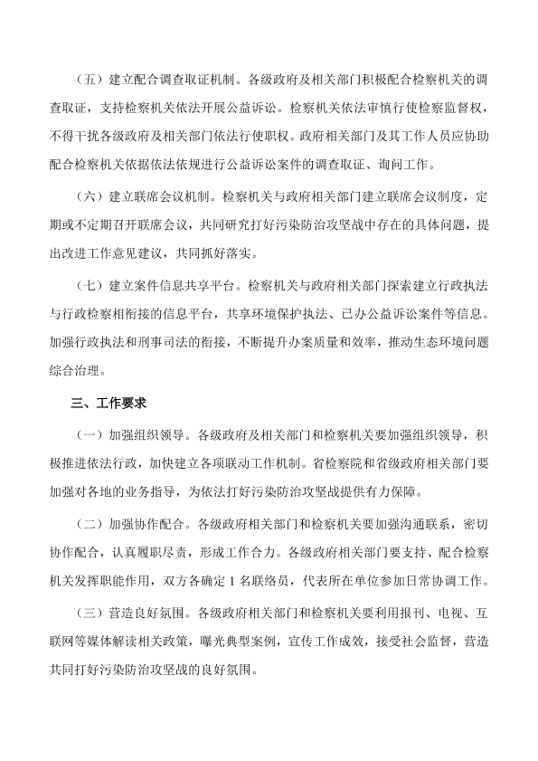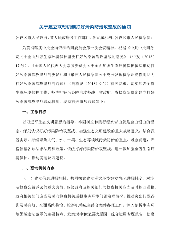 各设区市人民政府,省人民政府各工作部门、各直属机构,各设区市人民检察院: 为贯彻落实中央全面依法治国委员会第一次会议精神,根据《中共中央国务院关于全面加强生态环境保护坚决打好污染防治攻坚战的意见》(中发〔2018〕17号)、《全国人民代表大会常务委员会关于全面加强生态环境保护依法推动打好污染防治攻坚战的决议》和《最高人民检察院关于充分发挥检察职能作用助力打好污染防治攻坚战的通知》(高检发〔2018〕9号)有关要求,切实加强全省生态环境保护工作,坚决打好污染防治攻坚战,省政府、省检察院决定建立打好污染防治攻坚战联动机制。现就有关事项通知如下:
