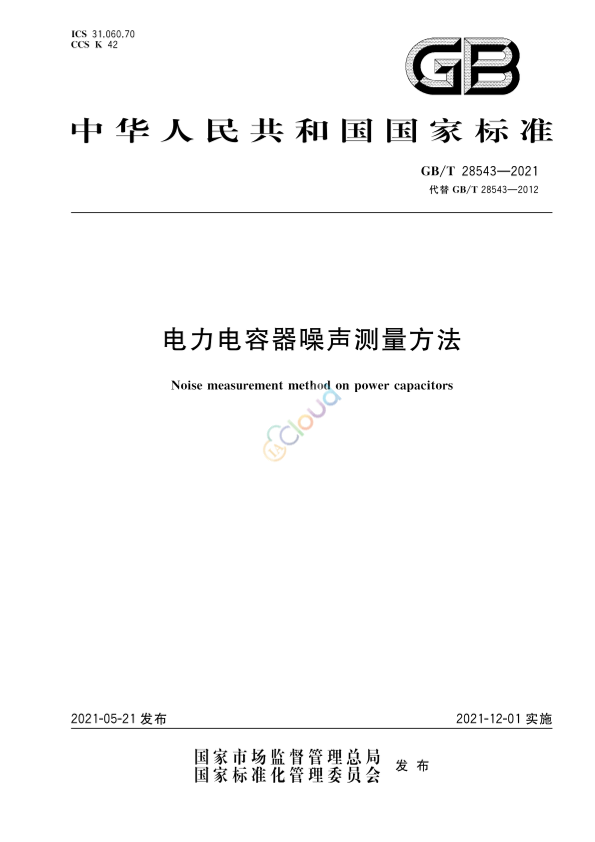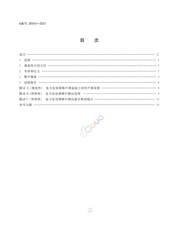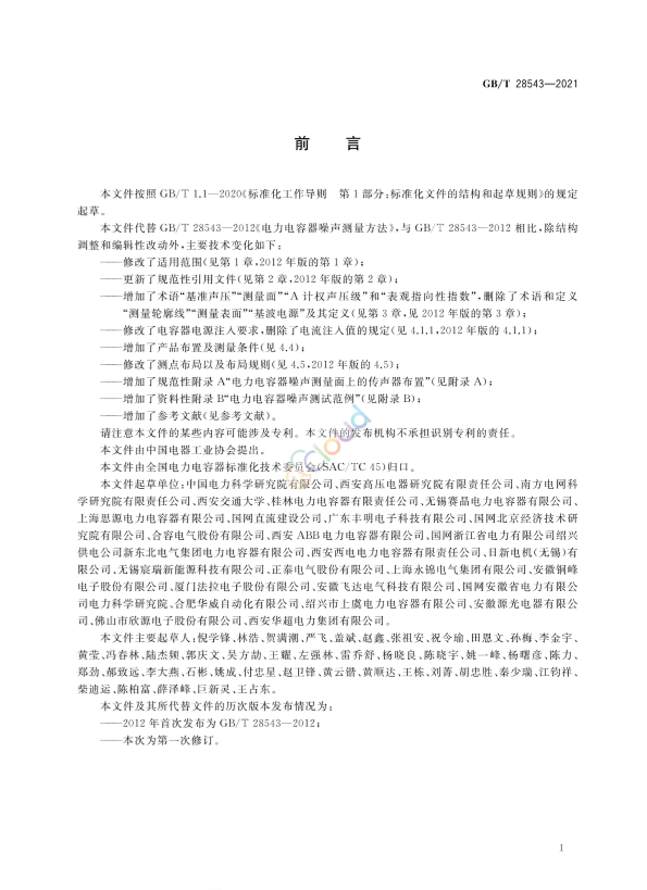 本文件按照GB/T1.1--2020《标准化工作导则第1部分:标准化文件的结构和起草规则》的规定起草。 本文件代替GB/T 28543- 2012《电力电容器噪声测量方法》,与GB/T 28543- 2012 相比.除结构调整和编辑性改动外,主要技术变化如下: 修改了适用范围(见第1章,2012年版的第1章); .更新了规范性引用文件(见第2章,2012年版的第2章); 增加了术语“基准声压”“测量面”“A计权声压级”和“表观指向性指数".删除了术语和定义 “测量轮廓线”“测量表面”“基波电源”及其定义(见第3章.见2012年版的第3章); 修改了电容器电源注人要求,删除了电流注人值的规定(见4.1.1,2012年版的4.1.1); 增加了产品布置及测量条件(见4.4); 修改了测点布局以及布局规则(见4.5.2012年版的4.5); 增加了规范性附录A"电力电容器噪声测量面上的传声器布置”(见附录A); 增加了资料性附录B"电力电容器噪声测试范例"(见附录B); 增加了参考文献(见参考文献)。 请注意本文件的某些内容可能涉及专利。本文件的发布机构不承担识别专利的责任。 本文件由中国电器工业协会提出。 本文件由全国电力电容器标准化技术委员会(SAC/TC45)归口。 本文件起草单位:中国电力科学研究院有限公司.西安高压电器研究院有限责任公司、南方电网科学研究院有限责任公司.西安交通大学.桂林电力电容器有限责任公司.无锡赛晶电力电容器有限公司、上海思源电力电容器有限公司.国网直流建设公司、广东丰明电子科技有限公司、国网北京经济技术研究院有限公司、合容电气股份有限公司、西安ABB电力电容器有限公司.国网浙江省电力有限公司绍兴供电公司新东北电气集团电力电容器有限公司,西安西电电力电容器有限责任公司、新电机(无锡)有限公司.无锡哀瑞新能源科技有限公司.正泰电气股份有限公司、上海永锦电气集团有限公司、安微铜峰电子股份有限公司.厦门法拉电子股份有限公司.安徽飞达电气科技有限公司、国网安徽省电力有限公司电力科学研究院.合肥华威自动化有限公司、绍兴市上虞电力电容器有限公司、安徽源光电器有限公司、佛山市欣源电子股份有限公司、西安华超电力集团有限公司。 本文件主要起草人:倪学锋、林浩.贺满潮、严飞、盖斌、赵鑫、张祖安.祝令瑜、田恩文、孙梅、李金宇、黄莹、冯春林、陆杰频、郭庆文.吴方劫、王耀、左强林、雷乔舒、杨晓良、陈晓宇.姚一峰。杨曙彦。陈力、郑劲.郝致远,李大燕.石彬、姚成、付忠星.赵卫锋.黄云借、黄顺达、王栋.刘菁.胡忠胜、秦少瑞.江钩祥、柴迪运、陈柏富、薛泽峰、巨新灵、王占东。 本文件及其所代替文件的历次版本发布情况为: -2012年首次发布为GB/T 28543- 2012; . 本次为第一次修订。