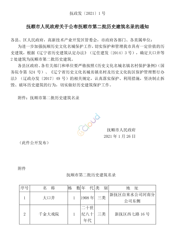 各县、区人民政府,高新技术产业开发区管委会,市政府各部门、各直属单位: 为进一步加强抚顺历史文化名城保护工作,切实保护和管理我市具有一定价值的历史建筑,根据《辽宁省历史建筑认定办法》(辽住建发〔2014〕3号),确定大口井等2处建筑为抚顺市第二批历史建筑。 各县区政府、各有关部门和单位要严格按照《历史文化名城名镇名村保护条例》(国务院令第524号)、《辽宁省历史文化名城名镇名村及历史文化街区保护管理暂行办法》(辽政办发〔2017〕49号)的相关规定,认真落实保护、利用措施,坚决制止拆毁、破坏历史建筑的行为,切实做好历史建筑保护工作。 附件:抚顺市第二批历史建筑名录 抚顺市人民政府 2021年1月26日
