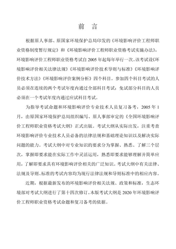 根据原人事部、原国家环境保护总局印发的《环境影响评价工程师职业资格制度暂行规定》和《环境影响评价工程师职业资格考试实施办法》,环境影响评价工程师职业资格考试自2005 年起每年举行一次。该考试设《环境影响评价相关法律法规》《环境影响评价技术导则与标准》《环境影响评价技术方法》《环境影响评价案例分析》四个科目。参加四个科目考试的人员必须在连续的两个考试年度内通过全部科目考试;免试部分科目的人员必须在一个考试年度内通过应试科目考试。 为指导考试命题和环境影响评价专业技术人员复习备考,2005 年1月,由原国家环境保护总局组织编写、原人事部审定的《全国环境影响评价工程师职业资格考试大纲》正式出版。考试大纲从实际出发,注重考查环境影响评价专业技术人员必备的法律法规和基础理论知识以及解决实际问题的能力。考试大纲中对专业知识的要求分为掌握、熟悉、了解三个层次,掌握即要求能在实际工作中灵活运用,熟悉即要求能够理解并简单应用,了解即要求具有环境影响评价相关的广泛知识。考试大纲中有关法律、法规及导则、标准的考试内容均为现行法律法规和导则标准中的相应内容。 近期,根据最新发布的环境影响评价相关法规、政策和标准,生态环境部对考试大纲进行了第十四次修订。本版考试大纲是2020 年环境影响评价工程师职业资格考试命题和复习备考的依据。