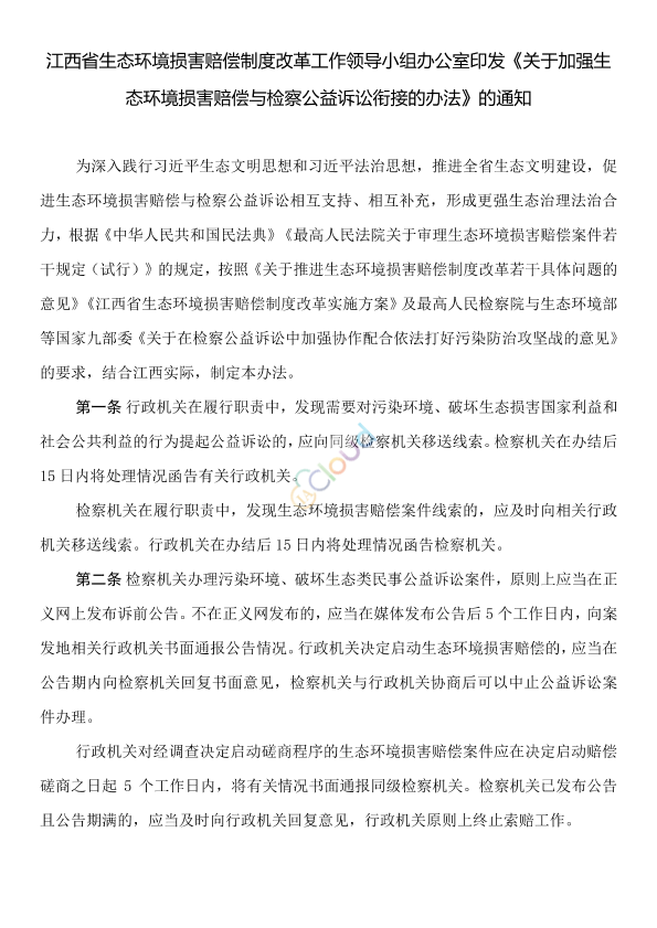 为深入践行习近平生态文明思想和习近平法治思想,推进全省生态文明建设,促进生态环境损害赔偿与检察公益诉讼相互支持、相互补充,形成更强生态治理法治合力,根据《中华人民共和国民法典》《最高人民法院关于审理生态环境损害赔偿案件若干规定(试行)》的规定,按照《关于推进生态环境损害赔偿制度改革若干具体问题的意见》《江西省生态环境损害赔偿制度改革实施方案》及最高人民检察院与生态环境部等国家九部委《关于在检察公益诉讼中加强协作配合依法打好污染防治攻坚战的意见》的要求,结合江西实际,制定本办法。