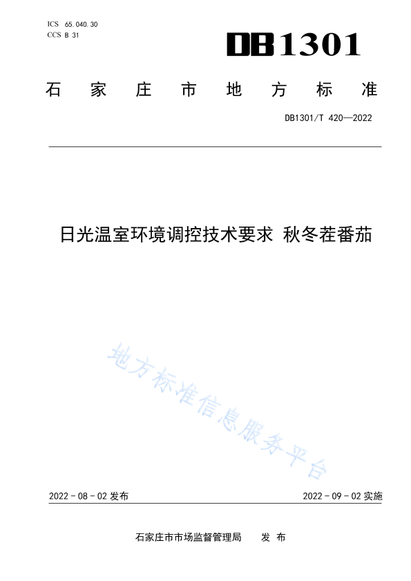 本文件规定了日光温室环境下秋冬茬番茄不同生育时期的环境参数调控范围及调控技术条件。 本文件适用于石家庄地区秋冬茬日光温室番茄栽培管理过程中环境调节与控制。