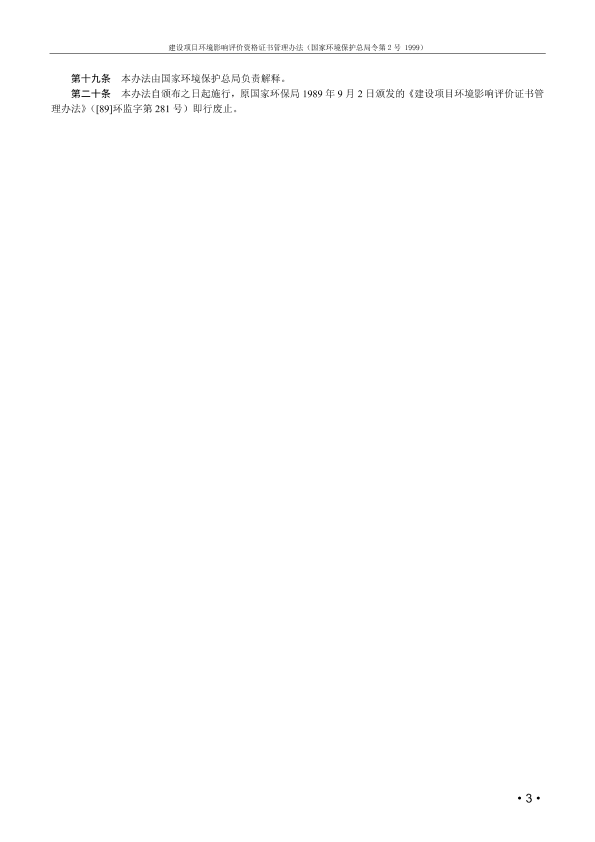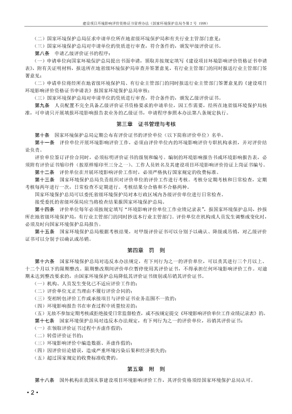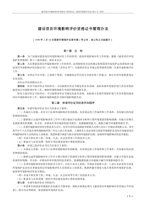 第一章 总 则 第一条 为了加强对建设项目环境影响评价工作的管理,提高环境影响评价工作质量,根据《建设项目环境保护管理条例》第十三条的规定,制定本办法。 第二条 凡从事建设项目环境影响评价工作的单位,必须按照本办法的规定取得国家环境保护总局颁发的《建设项目环境影响评价资格证书》(以下简称“评价证书”),并按照评价证书规定的等级和范围,从事环境影响评价工作。 第三条 评价证书分甲级、乙级两个等级,并根据持证单位的专业特长和工作能力,按行业和环境要素划定业务范围。 评价证书有效期为五年。 第四条 持有甲级评价证书的单位,可以按照评价证书规定的业务范围,承担各级环境保护部门负责审批的建设项目环境影响评价工作,编制环境影响报告书或环境影响报告表。 持有乙级评价证书的单位,可以按照评价证书规定的业务范围,承担地方各级环境保护部门负责审批的建设项目环境影响评价工作,编制环境影响报告书或环境影响报告表。 第二章 申请评价证书的条件和程序 第五条 申请甲级评价证书应当具备以下条件: (一)具备法人资格,具有专门从事环境影响评价的机构,具有固定的工作场所和工作条件,具有健全的内部管理规章制度; (二)能够独立完成环境影响评价工作中主要污染因子的调查分析和主要环境要素的影响预测,有能力开展生态现状调查和预测,有分析、审核协作单位提供的技术报告、监测数据的能力,能独立编写环境影响报告书; (三)从事环境影响评价的专职技术人员中,应至少有四名高级技术职称人员和六名以上中级技术职称人员,其中有不少于六人具备从事环境影响评价三年以上的工作业绩。上述所有人员必须符合国家环境保护总局对从事建设项目环境影响评价人员的持证上岗要求,熟悉和遵守国家与地方颁布的环境保护法规、标准和环境影响评价技术规范; (四)具备专职从事工程、环境、生态、社会经济等工作的技术人员; (五)配备有与业务范围一致的专项仪器设备和计算机绘图设备。 第六条 申请乙级评价证书应当具备以下条件: (一)具备法人资格,具有专门从事环境影响评价的机构,具有固定的工作场所和工作条件,具有健全的内部管理规章制度; (二)能够完成环境影响评价工作中主要污染因子的调查分析和主要环境要素的影响预测,有能力开展生态现状调查和预测,有分析、审核协作单位提供的技术报告、监测数据的能力并能独立编写环境影响报告书; (三)从事环境影响评价的专职技术人员中,应有六名以上的高、中级技术职称人员。上述人员必须符合国家环境保护总局对从事建设项目环境影响评价人员的持证上岗要求,熟悉和遵守国家与地方颁布的环境保护法规、标准和环境影响评价技术规范; (四)具备专职从事工程、环境、生态、社会经济等专项工作的技术人员; (五)配备有与业务范围一致的专项仪器设备和计算机绘图设备。 第七条 申请甲级评价证书的程序: (一)申请单位向国家环境保护总局提出书面申请,领取并按规定填写《建设项目环境影响评价资格证书申请表》,附有关证明材料,报送国家环境保护总局; (二)国家环境保护总局征求申请单位所在地省级环境保护局和有关行业主管部门意见; (三)国家环境保护总局对申请单位的资质进行审查,符合条件的,颁发甲级评价证书。 第八条 申请乙级评价证书的程序: (一)申请单位向国家环境保护总局提出书面申请,领取并按规定填写《建设项目环境影响评价资格证书申请表》,附有关证明材料,报送所在地省级环境保护局审查并签署意见,有行业主管部门的同时报送行业主管部门签署意见; (二)申请单位将经所在地省级环境保护局、有行业主管部门的同时报送行业主管部门签署意见的《建设项目环境影响评价资格证书申请表》报国家环境保护总局审核; (三)国家环境保护总局对申请单位的资质进行审查,符合条件的,颁发乙级评价证书。 第九条 人员配置不完全具备乙级评价证书资格要求的申请单位,因工作需要,经所在地省级环境保护局核准,可申请只开展填报环境影响报告表业务的乙级证书,申请程序参照本办法第八条规定执行。 第三章 证书管理与考核 第十条 国家环境保护总局定期公布有评价证书的评价单位(以下简称评价单位)名单。 第十一条 评价单位开展环境影响评价工作,必须由评价单位内的环境影响评价专职机构承担,并对评价结论负责。 评价单位签订评价合同时,必须标明评价证书的级别和编号。编制的环境影响报告书或环境影响报告表,必须附有评价证书缩印件(按原样缩印至三分之一)、工作人员姓名及其建设项目环境影响评价持证上岗证书编号。 第十二条 评价单位在开展环境影响评价工作时,必须严格执行国家规定的收费标准。 第十三条 国家环境保护总局负责组织对评价单位的评价工作进行考核。考核分定期考核和日常检查,定期考核每两年进行一次,日常检查不定期进行。考核结果分合格和不合格两种。 国家环境保护总局可以委托省级环境保护局对本行政区域内各级评价单位进行日常检查。 接受委托的省级环保局应当将检查结果报国家环境保护总局。 第十四条 评价单位每年必须按规定填写“环境影响评价单位工作业绩记录表”,报国家环境保护总局,抄报所在地省级环境保护局,有行业主管部门的同时