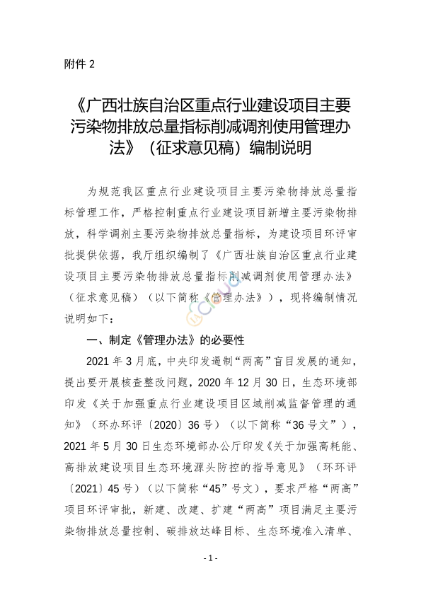 为规范重点行业建设主要污染物排放总量指标管理工作,严格控制重点行业建设项目新增主要污染物排放,科学调剂主要污染物排放指标,为建设项目环评审批提供依据,确保项目投产后区域环境质量不恶化,我厅组织编制了《广西壮族自治区重点行业建设项目主要污染物排放总量指标削减调剂使用管理办法(征求意见稿)》,现向社会公开征求意见,请于2021年8月3日前将反馈意见发送至邮箱hpc@sthjt.gxzf.gov.cn,提交意见时请留下姓名和联系方式,以便进一步联系。 联系人及联系电话:杨春琳,0771-5714276 冯 媛,0771-5773956。