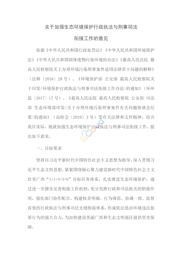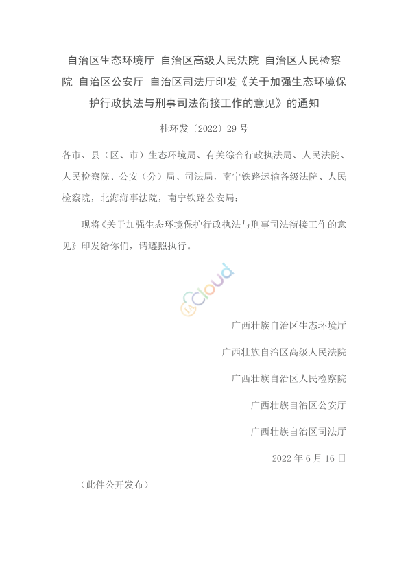 各市、县(区、市)生态环境局、有关综合行政执法局、人民法院、人民检察院、公安(分)局、司法局,南宁铁路运输各级法院、人民检察院,北海海事法院,南宁铁路公安局: 现将《关于加强生态环境保护行政执法与刑事司法衔接工作的意见》印发给你们,请遵照执行。 广西壮族自治区生态环境厅 广西壮族自治区高级人民法院 广西壮族自治区人民检察院 广西壮族自治区公安厅 广西壮族自治区司法厅 2022年6月16日