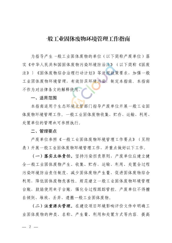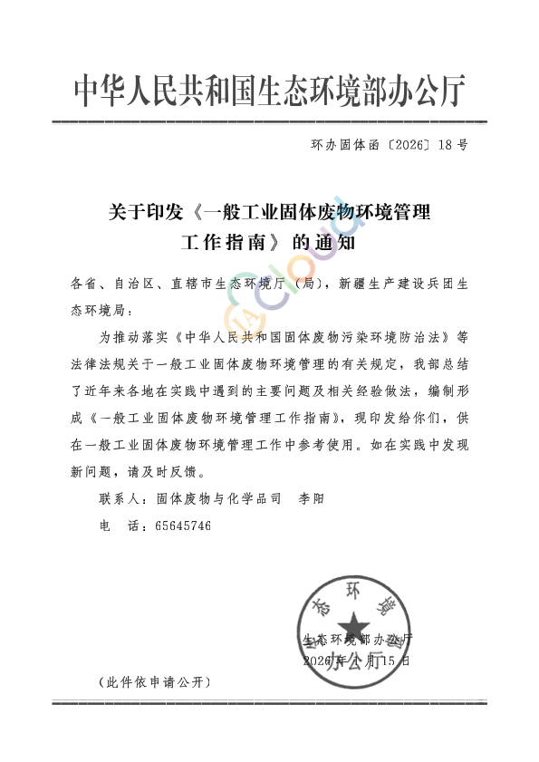 各省、自治区、直辖市生态环境厅(局),新疆生产建设兵团生态环境局: 为推动落实<<中华人民共和国固体废物污染环境防治法>>等法律法规关于一般工业固体废物环境管理的有关规定,我部总结了近年来各地在实践中遇到的主要问题及相关经验做法,编制形成《一般工业固体废物环境管理工作指南》,现印发给你们,供在一般工业固体废物环境管理工作中参考使用。如在实践中发现新问题,请及时反馈。 联系人:固体废物与化学品司李阳 电话:65645746 生态环境部办公厅 2026年1月15日