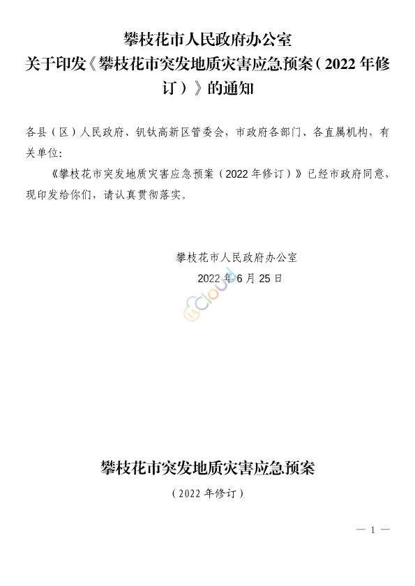 各县(区)人民政府、钒钛高新区管委会,市政府各部门、各直属机构,有关单位: 《攀枝花市突发地质灾害应急预案(2022年修订)》已经市政府同意,现印发给你们,请认真贯彻落实。 攀枝花市人民政府办公室 2022年6月25日