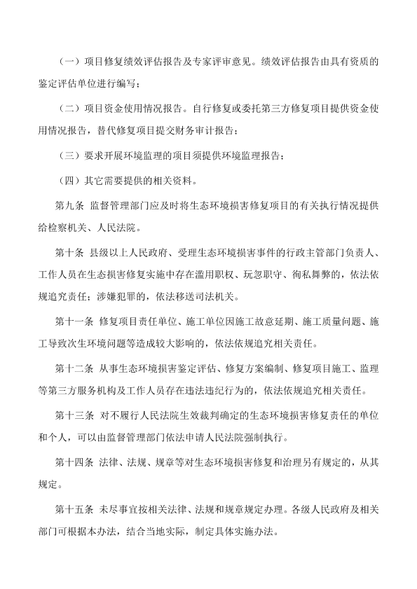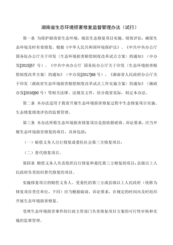 各市州、县市区人民政府,省政府各厅委、各直属机构: 《湖南省生态环境损害调查办法(试行)》、《湖南省生态环境损害修复监督管理办法(试行)》、《湖南省生态环境损害赔偿磋商管理办法(试行)》、《湖南省生态环境损害赔偿资金管理办法(试行)》已经省人民政府同意,现印发给你们,请认真组织实施。 湖南省人民政府办公厅 2017年12月27日