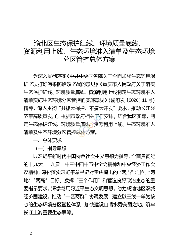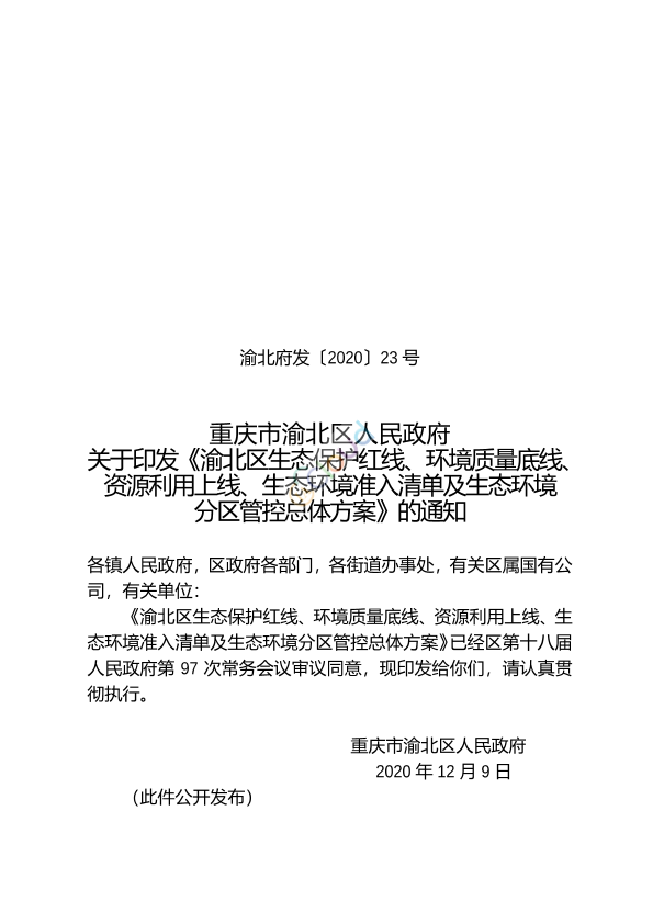 各镇人民政府,区政府各部门,各街道办事处,有关区属国有公司,有关单位: 《渝北区生态保护红线、环境质量底线、资源利用上线、生态环境准入清单及生态环境分区管控总体方案》已经区第十八届人民政府第97次常务会议审议同意,现印发给你们,请认真贯彻执行。 重庆市渝北区人民政府 2020年12月9日
