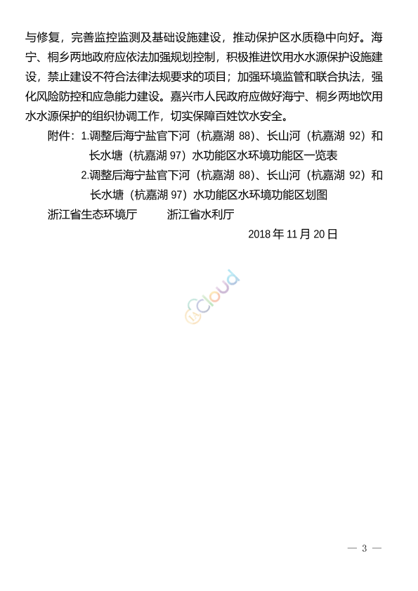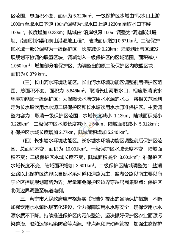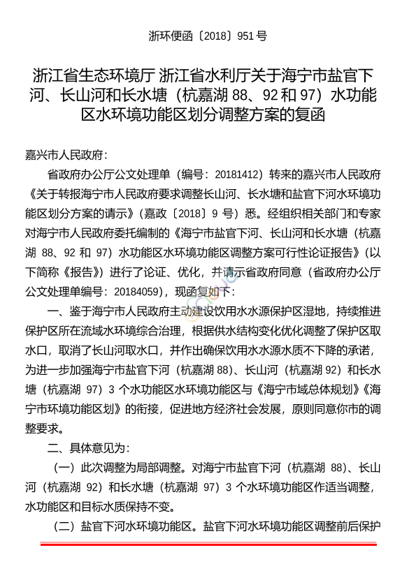 嘉兴市人民政府: 省政府办公厅公文处理单(编号:20181412)转来的嘉兴市人民政府《关于转报海宁市人民政府要求调整长山河、长水塘和盐官下河水环境功能区划分方案的请示》(嘉政〔2018〕9号)悉。经组织相关部门和专家对海宁市人民政府委托编制的《海宁市盐官下河、长山河和长水塘(杭嘉湖88、92和97)水功能区水环境功能区调整方案可行性论证报告》(以下简称《报告》)进行了论证、优化,并请示省政府同意(省政府办公厅公文处理单编号:20184059),现函复如下: