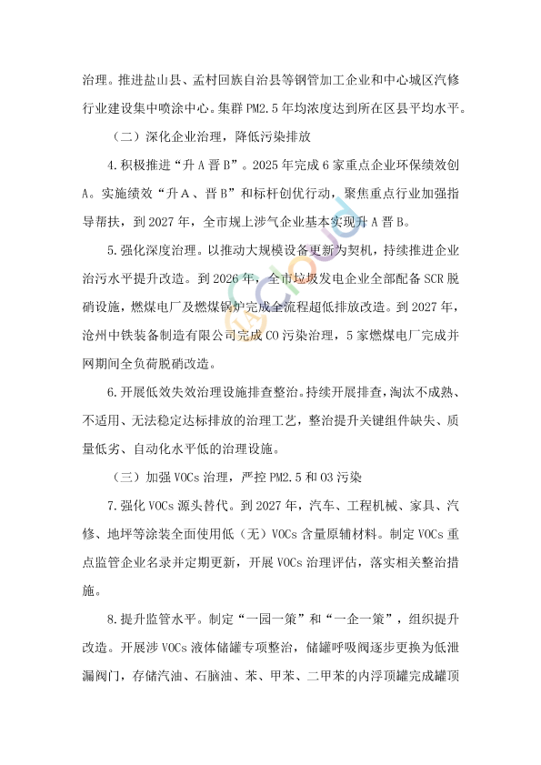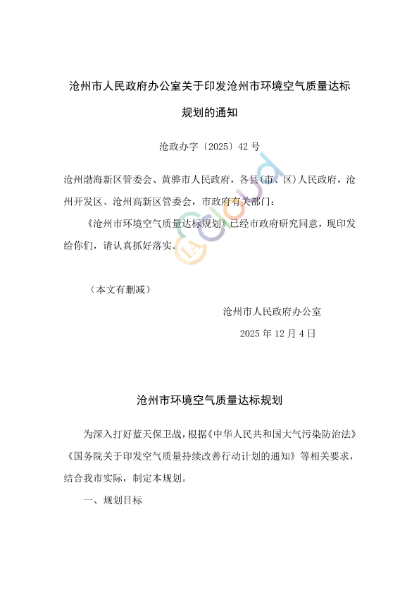 沧州渤海新区管委会、黄骅市人民政府,各县(市、区)人民政府,沧州开发区、沧州高新区管委会,市政府有关部门: 《沧州市环境空气质量达标规划》已经市政府研究同意,现印发给你们,请认真抓好落实。 (本文有删减) 沧州市人民政府办公室 2025年12月4日