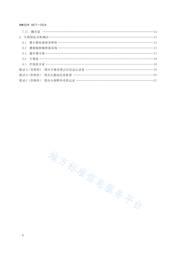 本文件规定了周丛生物调查点位布设、样品采集与保存以及物理、化学和生物指标分析测试的要求。 本文件适用于稻田、沟渠、河流、水库、湖泊等湿地或浅水水体中周丛生物采样点的布设、采集、保存以及物理、化学和生物性质的定量表征或测试分析。