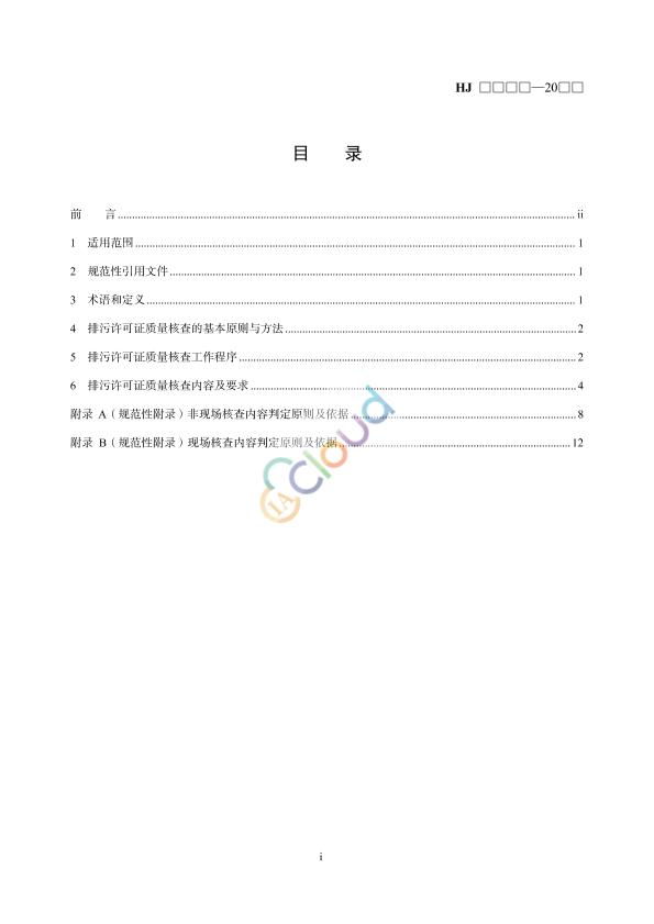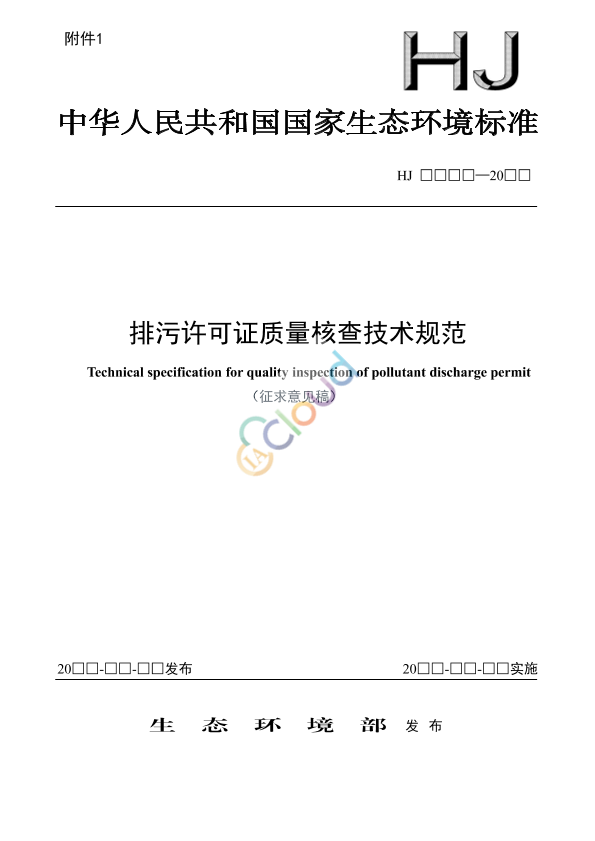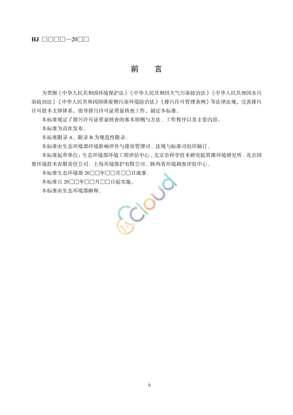 为贯彻《中华人民共和国环境保护法》《中华人民共和国大气污染防治法》《中华人民共和国水污 染防治法》《中华人民共和国固体废物污染环境防治法》《排污许可管理条例》等法律法规,完善排污 许可技术支撑体系,指导排污许可证质量核查工作,制定本标准。 本标准规定了排污许可证质量核查的基本原则与方法、工作程序以及主要内容。 本标准为首次发布。 本标准附录 A、附录 B 为规范性附录。 本标准由生态环境部环境影响评价与排放管理司、法规与标准司组织制订。 本标准起草单位:生态环境部环境工程评估中心、北京市科学技术研究院资源环境研究所、北京国 寰环境技术有限责任公司、上海环境保护有限公司、陕西省环境调查评估中心。 本标准生态环境部 20□□年□□月□□日批准。 本标准自 20□□年□□月□□日起实施。 本标准由生态环境部解释