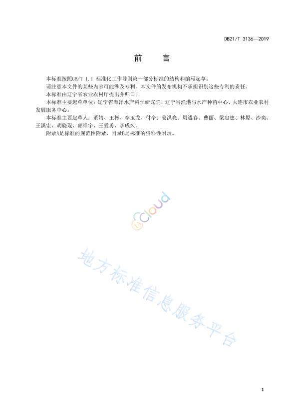 本标准按照GB/T 1.1 标准化工作导则第一部分标准的结构和编写起草。 请注意本文件的某些内容可能涉及专利。本文件的发布机构不承担识别这些专利的责任。 本标准由辽宁省农业农村厅提出并归口。 本标准主要起草单位:辽宁省海洋水产科学研究院、辽宁省渔港与水产种苗中心、大连市农业农村发展服务中心。 本标准主要起草人:董婧、王彬、李玉龙、付辛、姜洪亮、周遵春、曹丽、梁忠德、林原、沙爽、王溪宏、胡骁琨、郭维宇、王爱勇、李成久。 附录A是标准的规范性附录,附录B是标准的资料性附录。